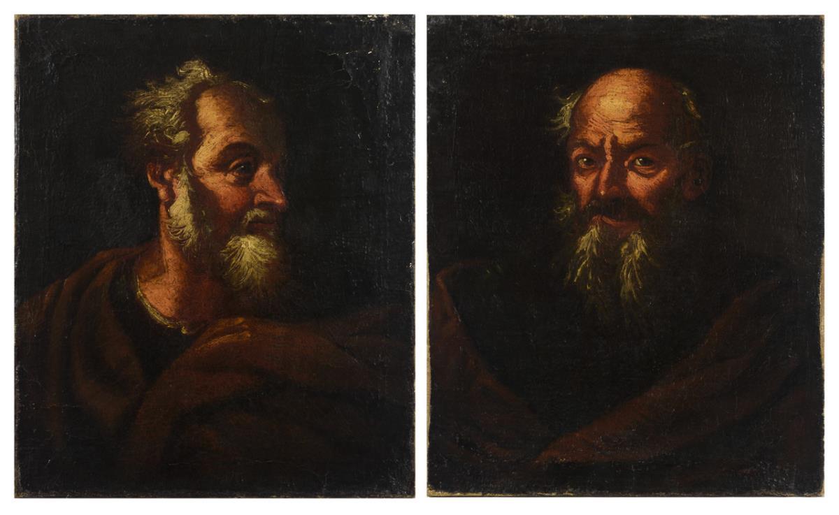 Two character representations of old men with white beards and in brown robes against a dark background. Each canvas doubled, traces of age.