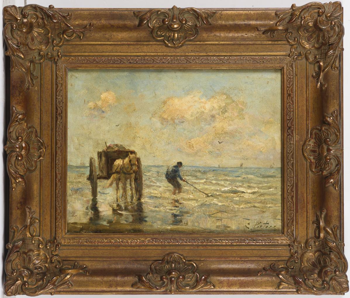 The fisherman with the horse-drawn cart on the beach in the bright sunlight. Restored.