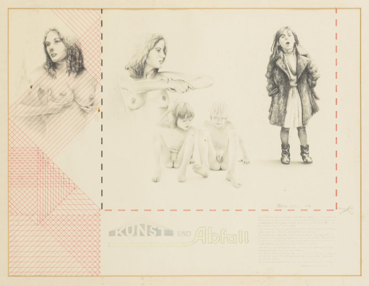 Pencil drawing, ink, red pen. Pencil signature. Dated "1/77."
