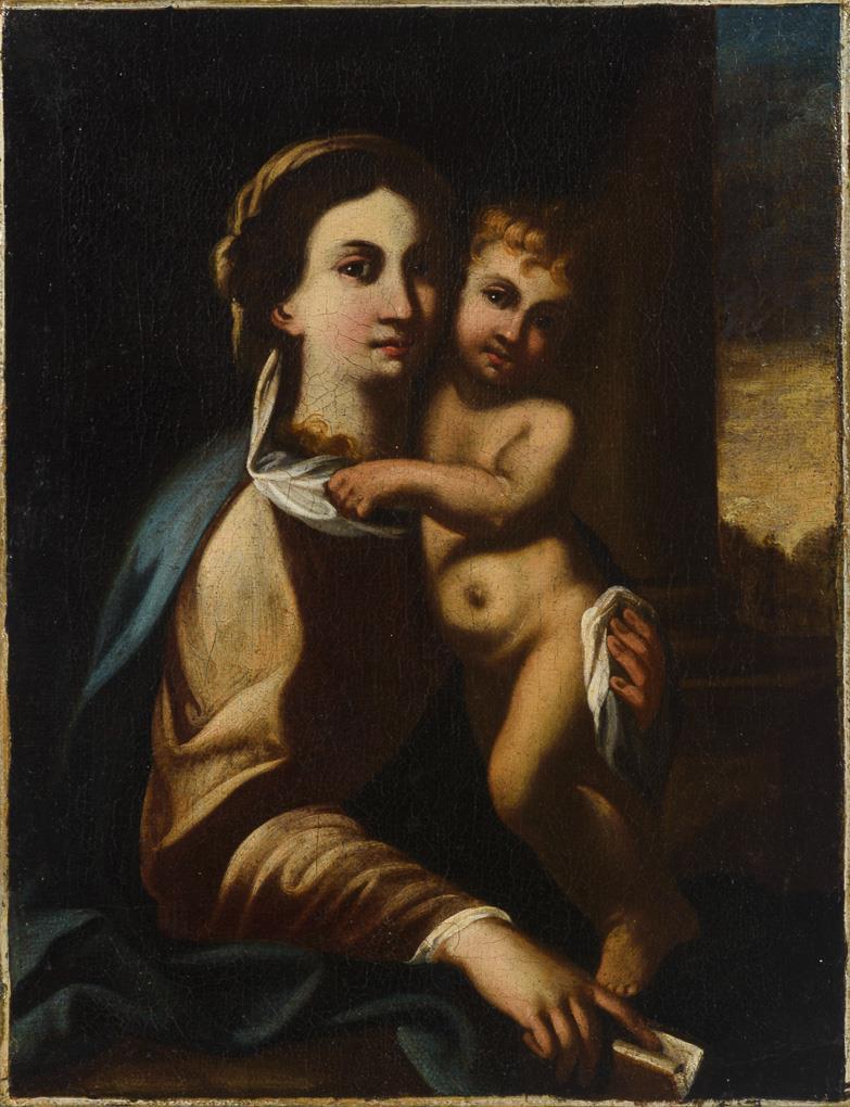 Mary with book and the baby Jesus standing on her lap near a column. Canvas doubled.