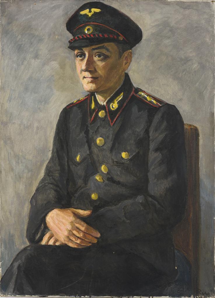 Junger Mann in dunkelblauer Uniform auf einem Stuhl vor grauer Wand. Altersspuren.