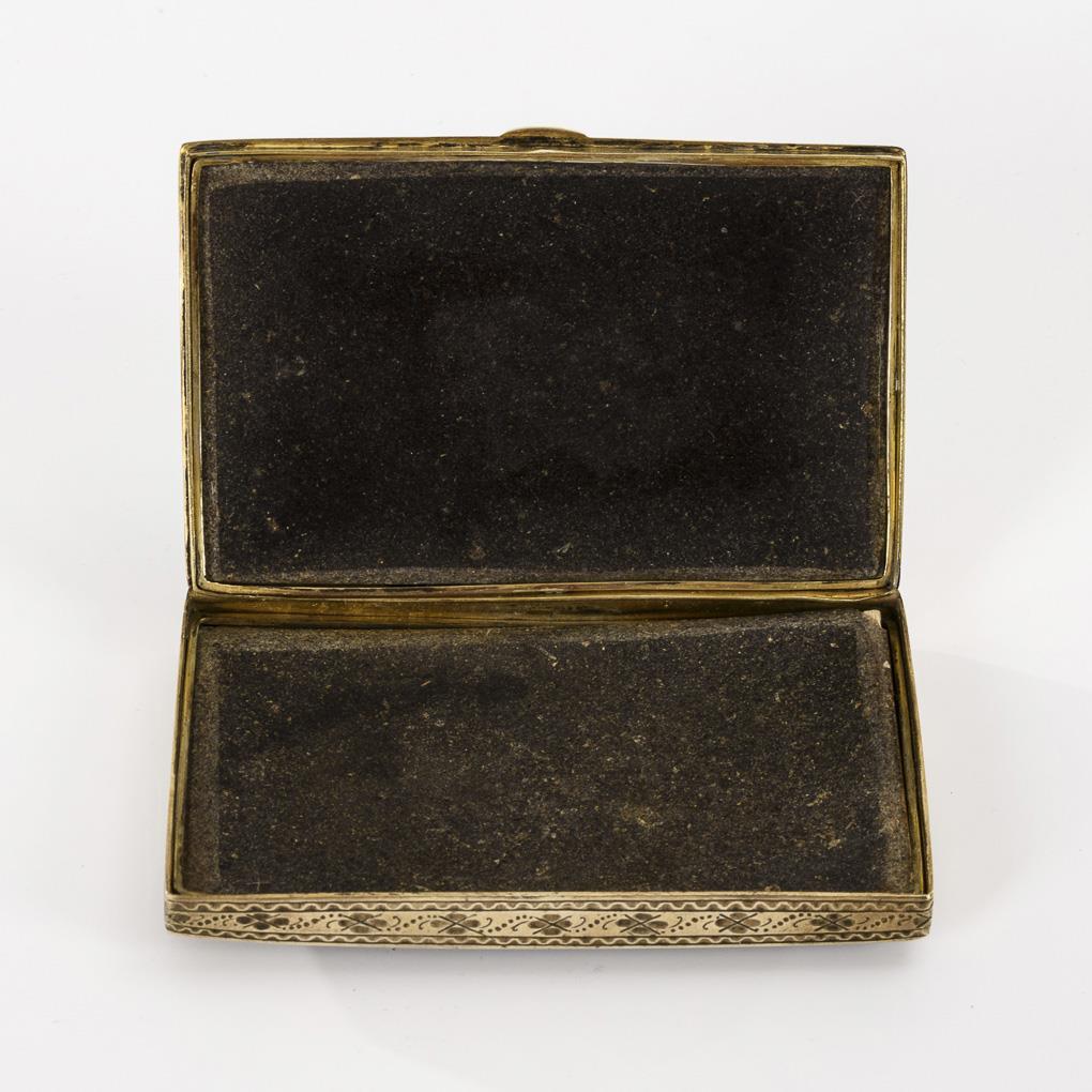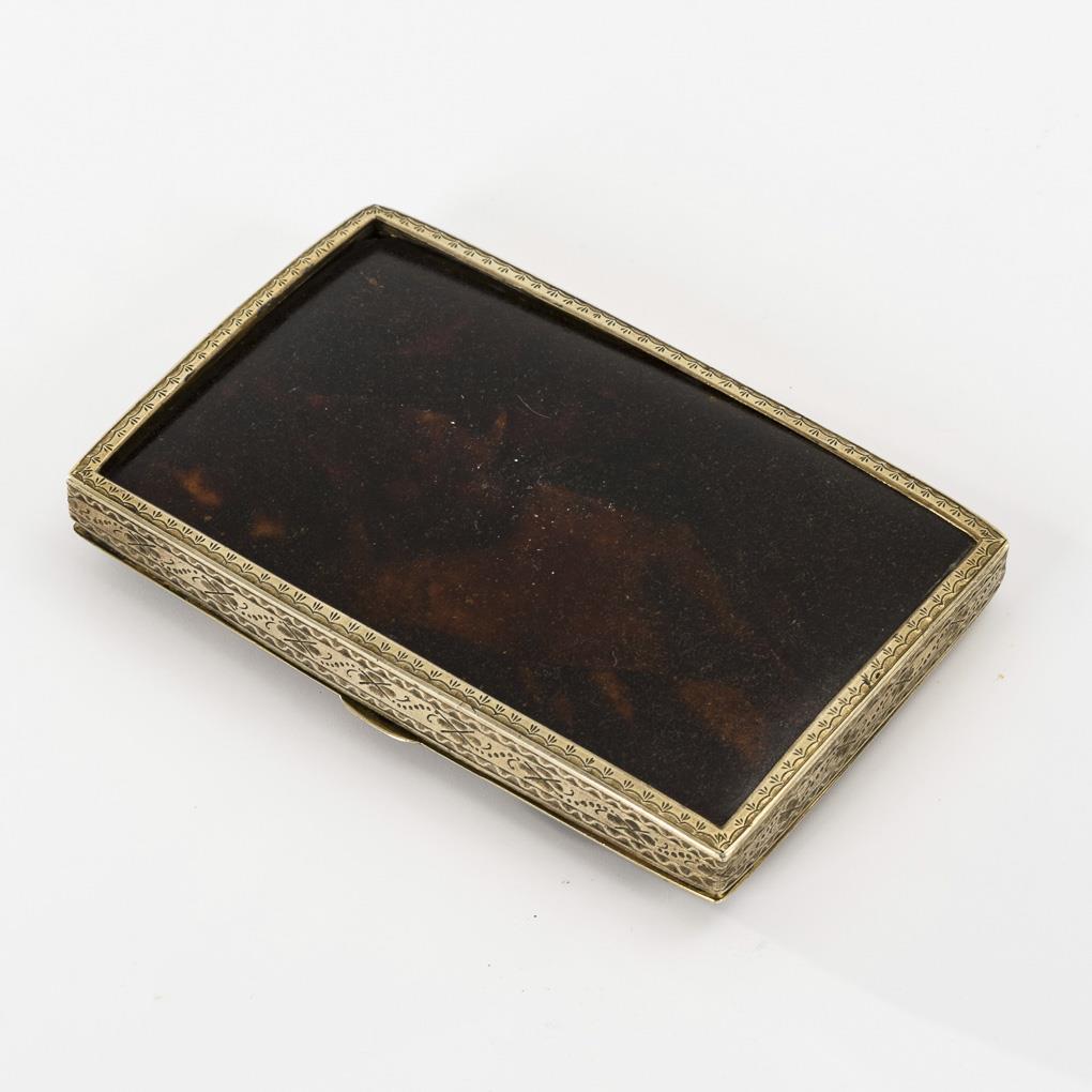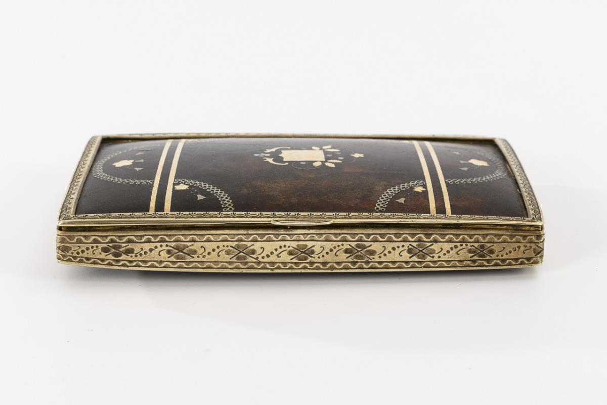 Silver gilt tested, imitation tortoiseshell, metal inlays partly gilt. 1.5 x 11 x 7 cm.