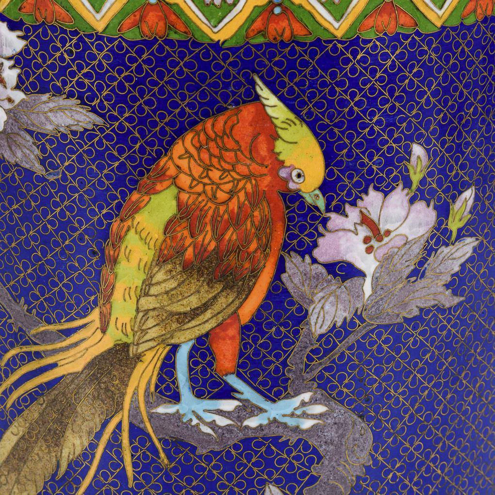 Blue background with shamrock pattern. Peacock in colorful plumage between splendid blooming peonies. Back with smaller colorful bird on hibiscus branch. Bottom and inner surface turquoise enameled. A very small chipping on the side, upper brass rim dented in places.