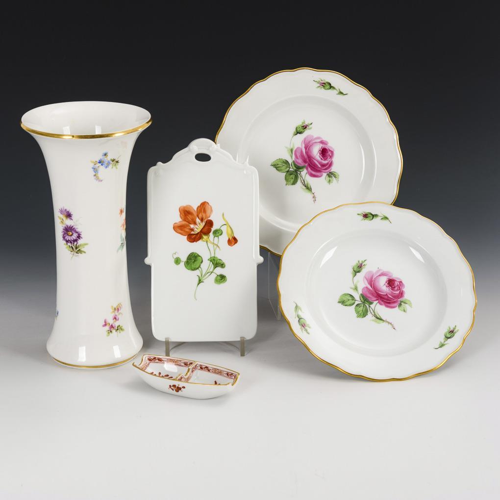 Flute vase with scattered floral painting (h 24,5 cm), 2 plates "Red Rose" (Ø 20 cm), 1 board with floral painting (l 20 cm) and 1 boat-shaped ashtray (l 10,5 cm).