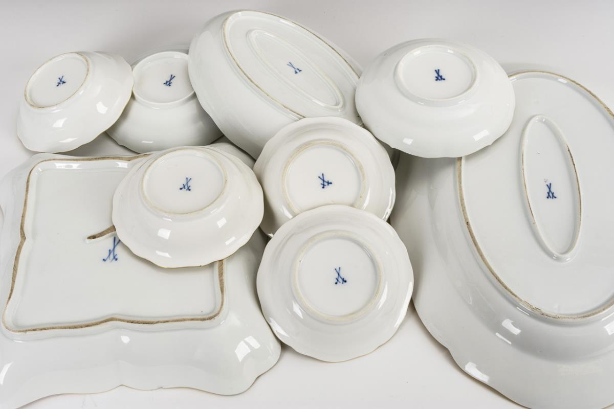 Form "New Cutout". Oval plate (L 35 cm), oval bowl (L 23,5 cm), square bowl (24 x 24 cm), 4 compote bowls (Ø 12 cm) and 2 saucers (Ø 14 cm). Partial gold rubbing.
