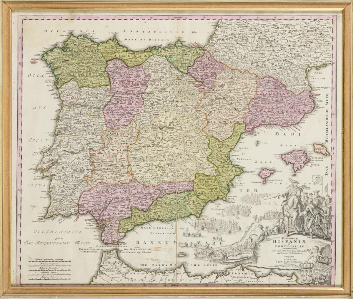 Detailed map of Spain and Portugal, with figural title-cartouche "Regnorum Hispaniae et Portugalliae [...]". Back-tacked centerfold, spotted.