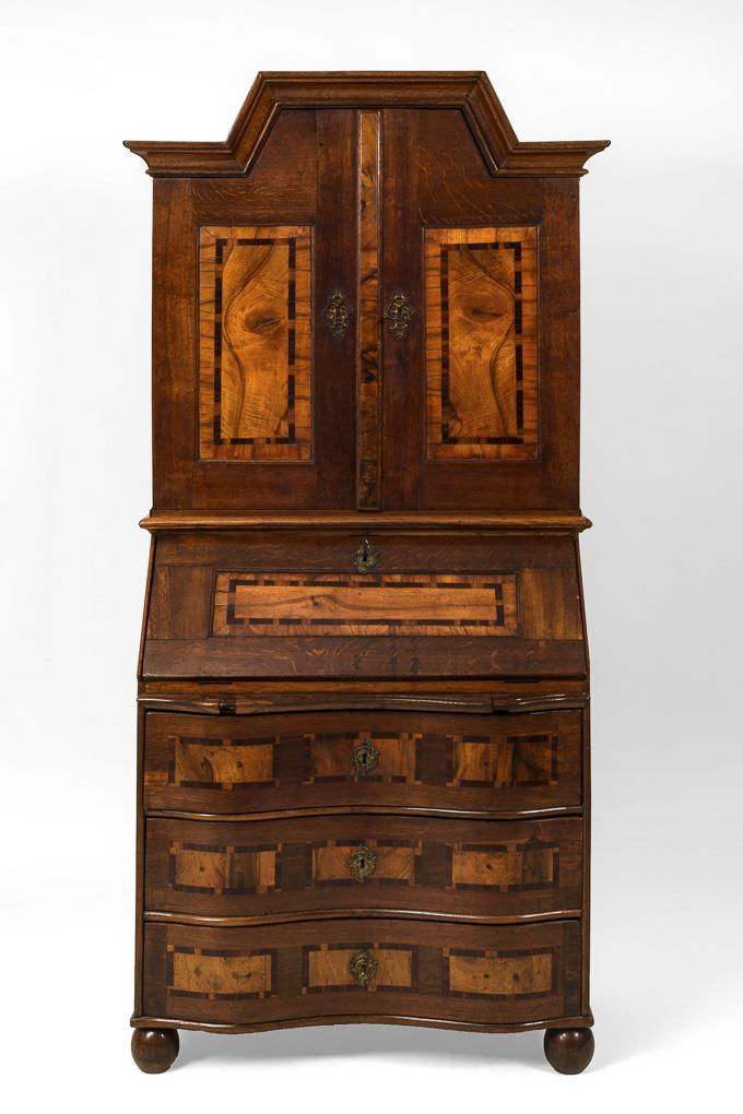 Writing cabinet with hinged writing top and stepped, 2-door attachment; commode-shaped lower part with 3 frontally curved drawers, on 4 ball feet, decorated with lighter veneer and ribbon inlays, rocaille-shaped key fittings; attachment inside with 3 shelves, writing part with 2 open compartments and 4 small drawers. Old restored, dry cracks.