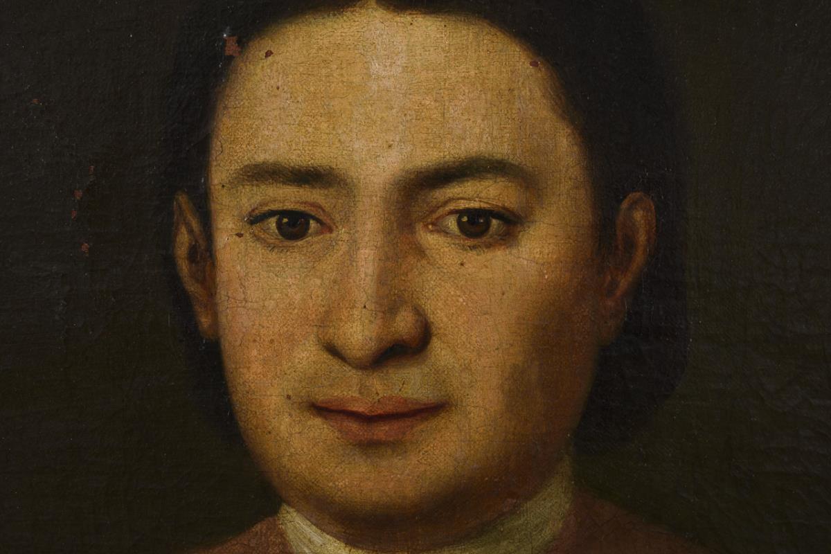 Portrait of a young man in a pink frock coat with vest. Canvas doubled, traces of age.