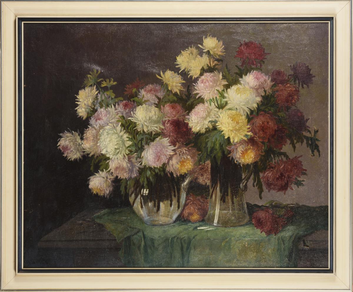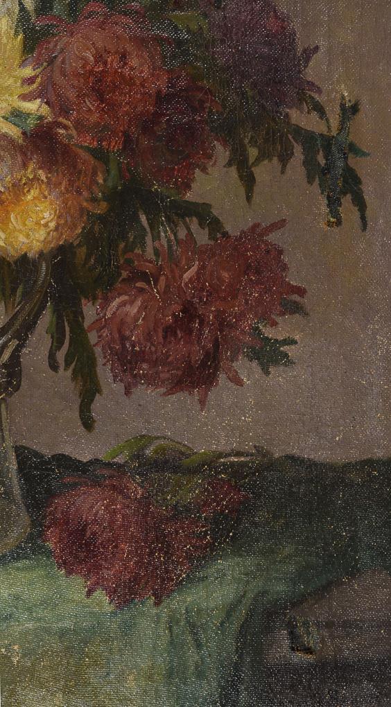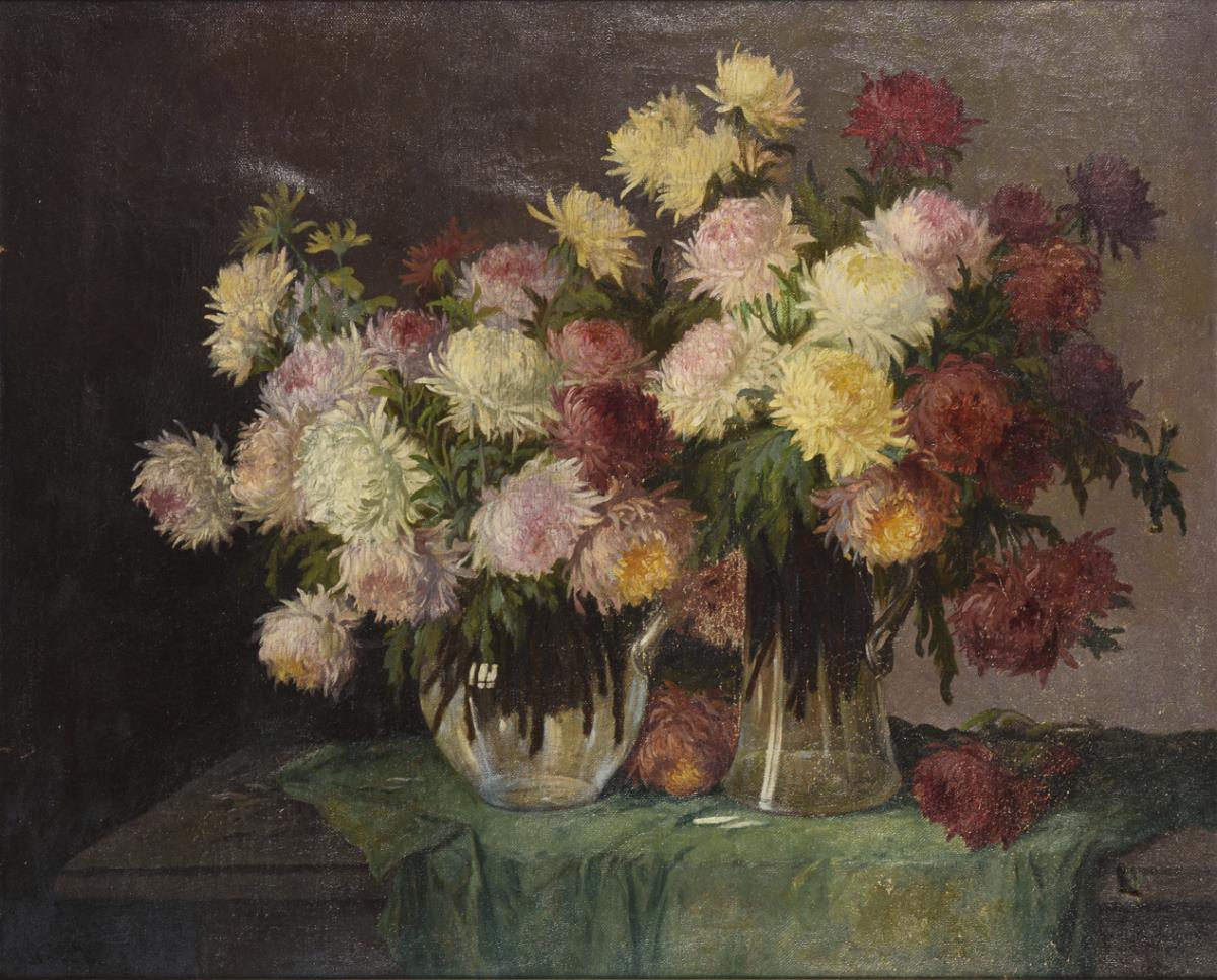 Chrysanthemums in different colors in two glass vases on a table. Two defects.