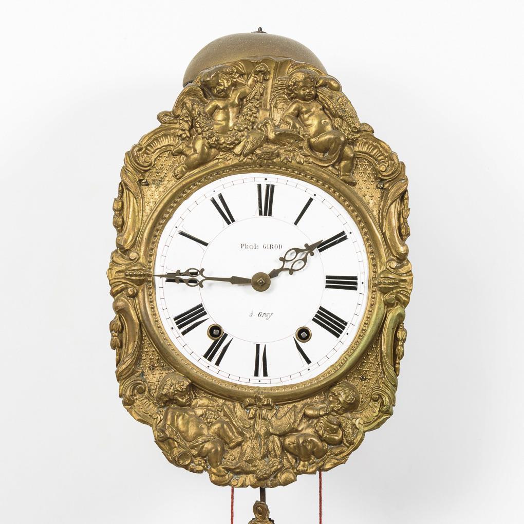 brass wheel movement with escapement and strike on bell, function not tested. White enamel dial with Roman numerals, minute ring and pierced brass hands, marked "Placide Girod à Gray".