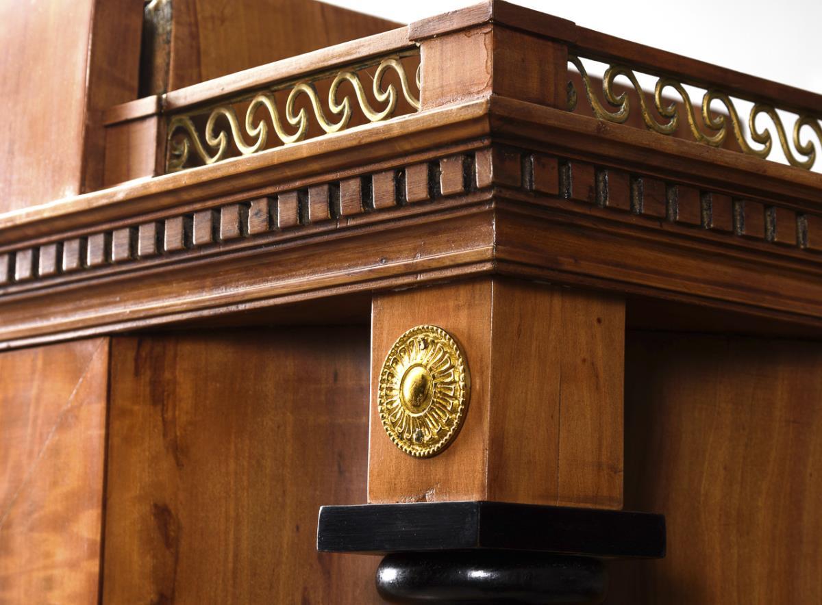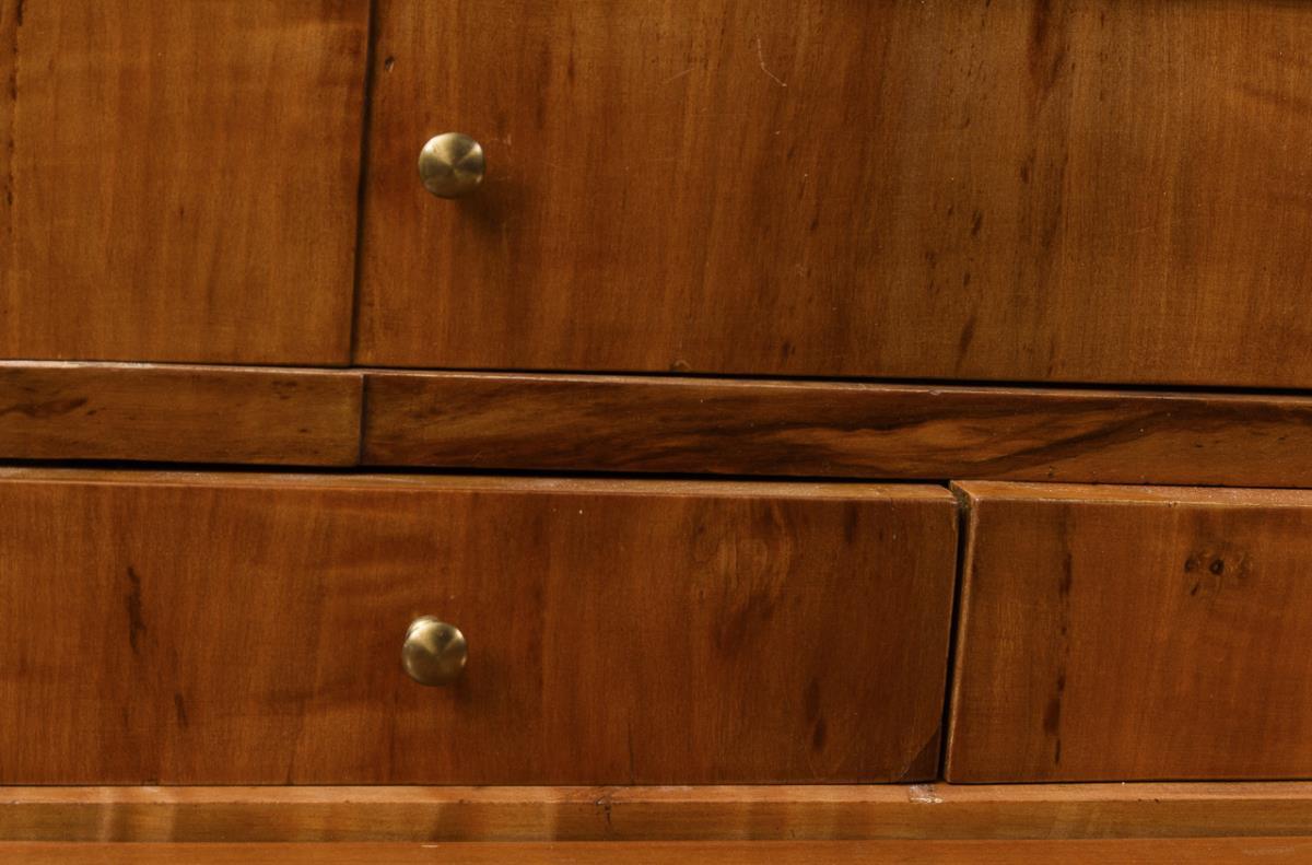 3-bay dresser base on tapering square legs, center section with hinged writing tabletop (unfolded with green edged velvet cover) and a total of 4 smaller, 2-row stacked drawers, top with mirrored door and 2 fully plastic ebonized columns, stepped cornice with drawer and brass balustrade; discreetly decorated with classical brass appliqués, meandering grilles and serrated bands typical of Hoffmann workshops. Top painted blue inside, with 2 shelves. Restored ready for living, locks supplemented. 4 keys.
