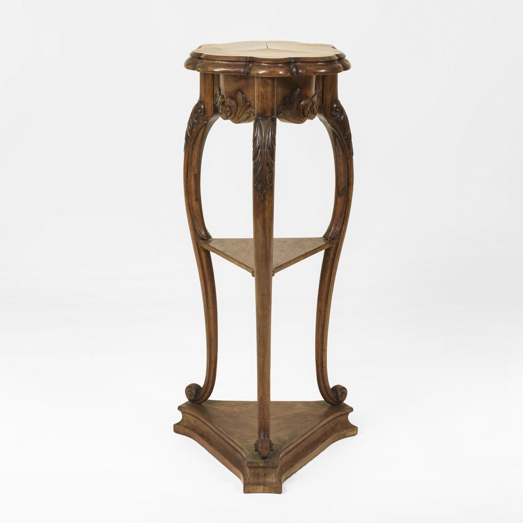 Pedestal in baroque style with matching shaped top plate, on 3 curved legs with triangular base plate and central shelf, decorated with volute carvings. Slight signs of age / use.