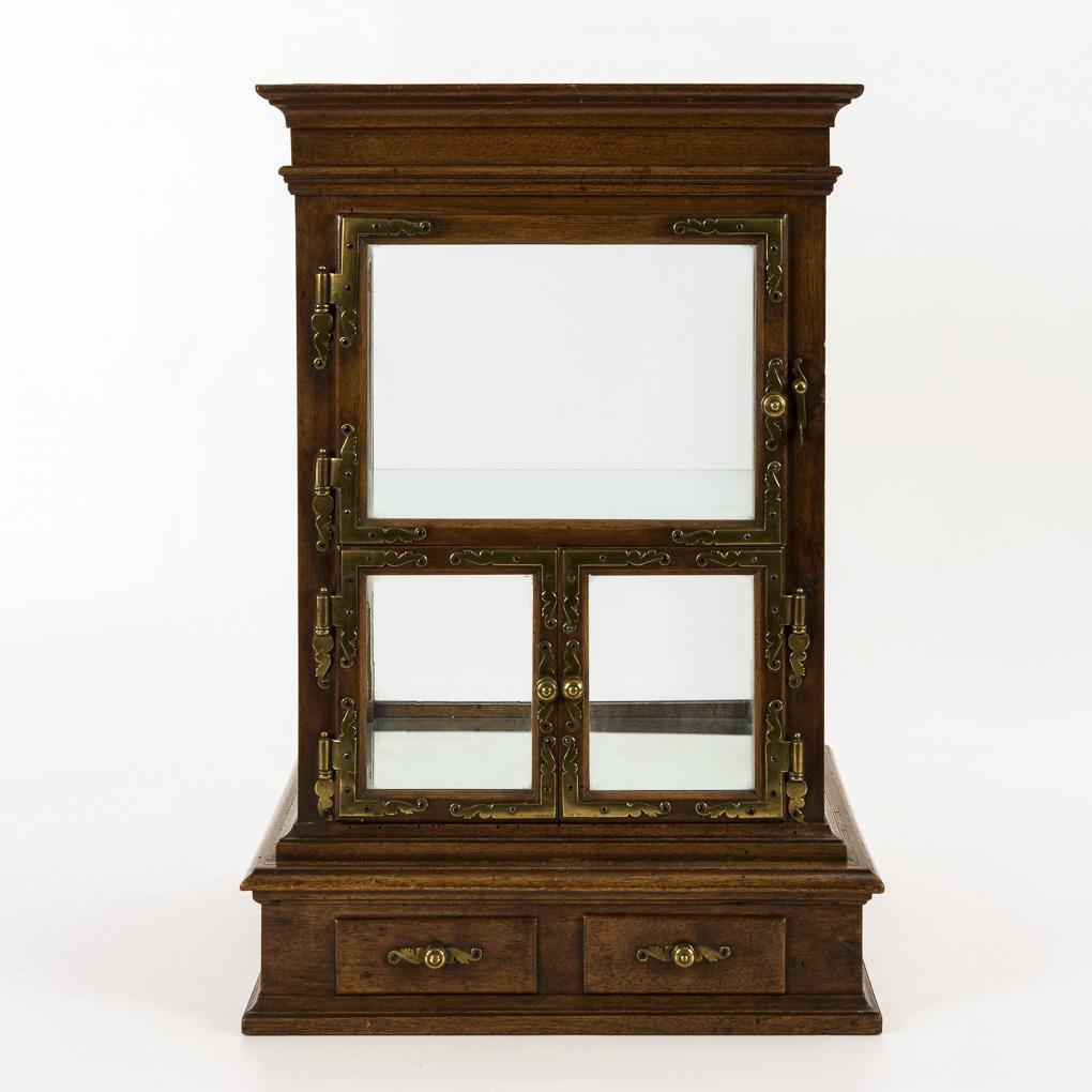 4-sided glazed display case on slightly flared base with 2 small drawers, removable lid by hook-eye principle, frontal 3-door with floral metal decoration; inside 1 shelf of glass and mirrored bottom. Traces of age/use, inactive anobia attack, top plate slightly corrugated, with drying cracks.