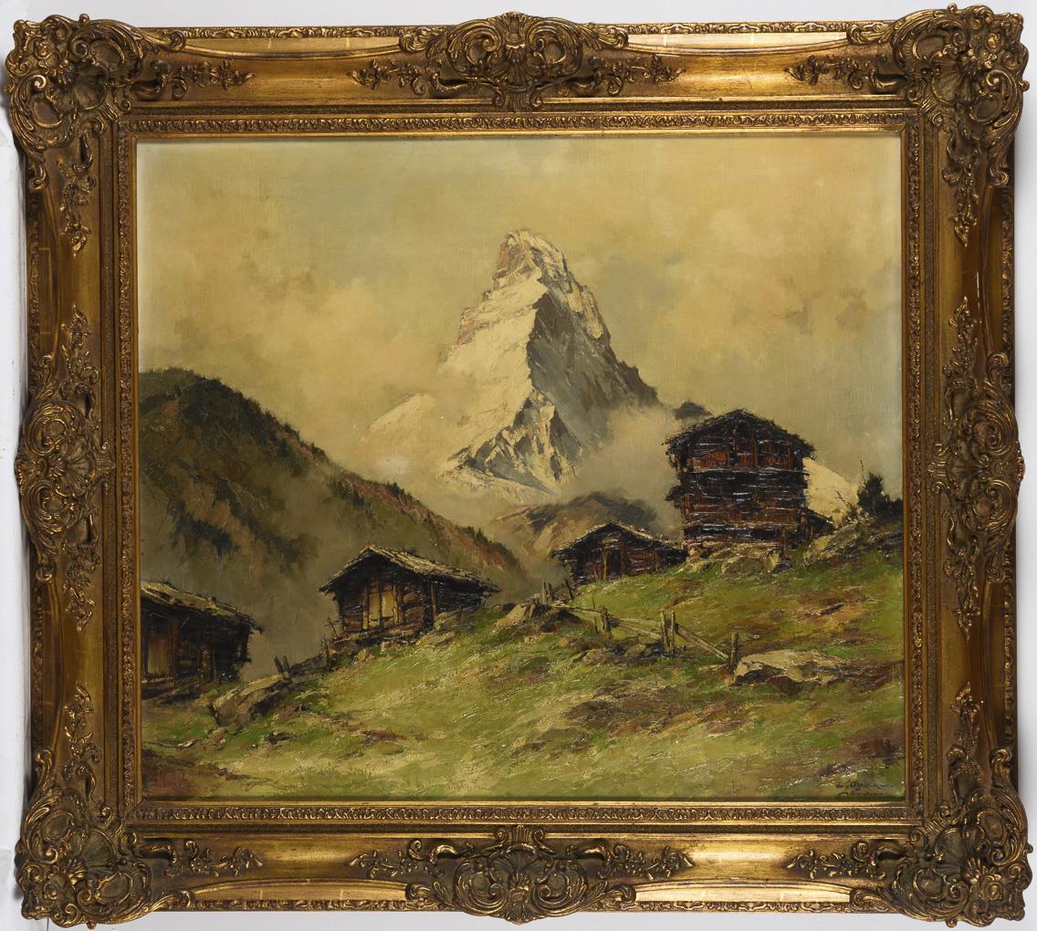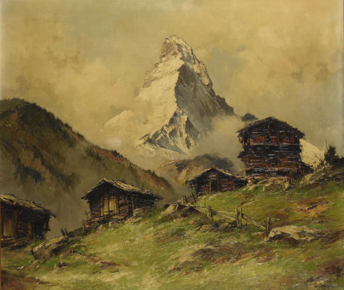 Alpine houses on the Riffelalp in front of the Matterhorn.