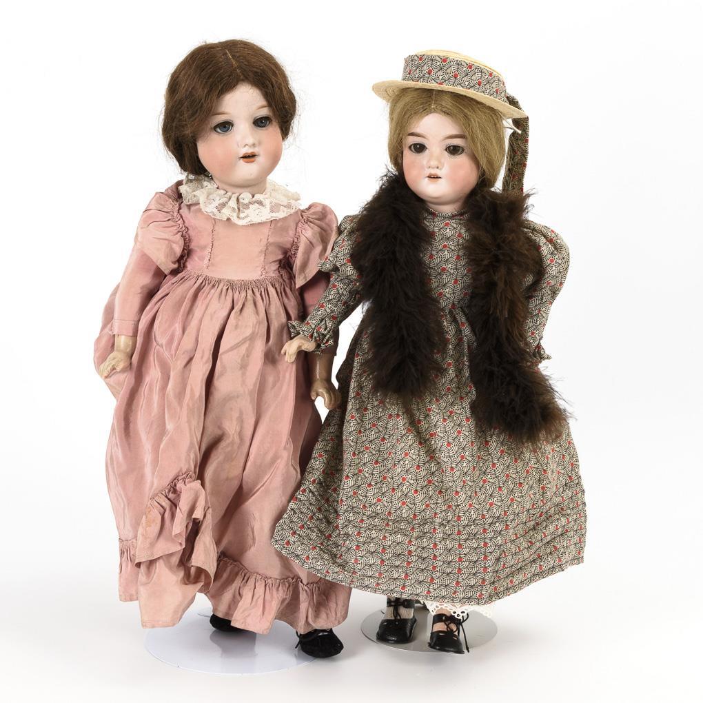 Both with crank head, sleeping eyes and real hair wig. 9- and 13-piece link body. Pink and patterned dress respectively with feather boa and hat. 1x head x-rayed: without defects. / 1x wig tight: with small chip in the corner of the left eye, left hand with bumps.