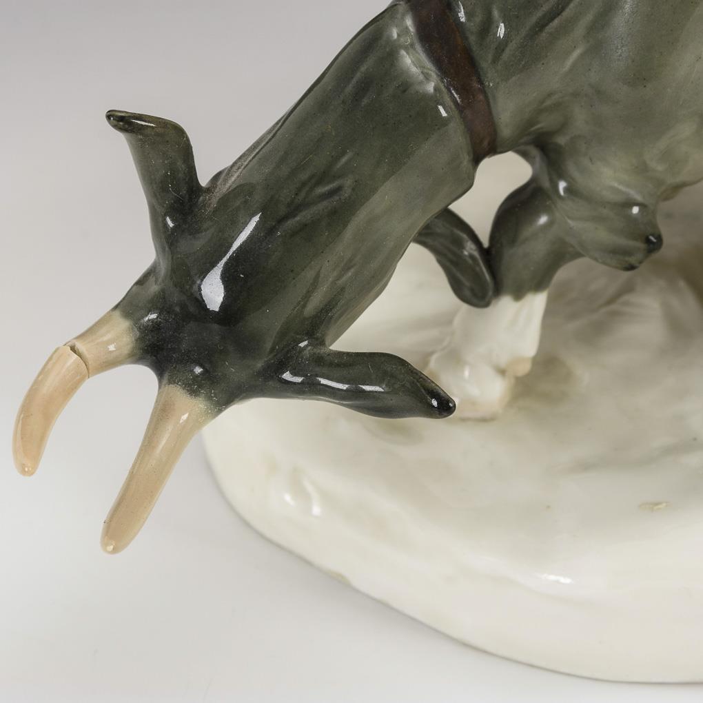 Girl standing on a grass base, fighting with two wayward goats. Goat horns and girl figure restored, 1 goat horn restored and broken.