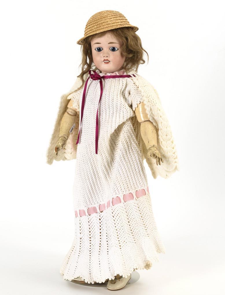 Crank head, fixed blue eyes, pierced ears, blonde human hair wig. 15-piece articulated body. White crochet dress with jacket, straw hat, white oilcloth shoes. Head x-rayed: without defects. Body with color defects, 1 finger missing, one temporarily supplemented.