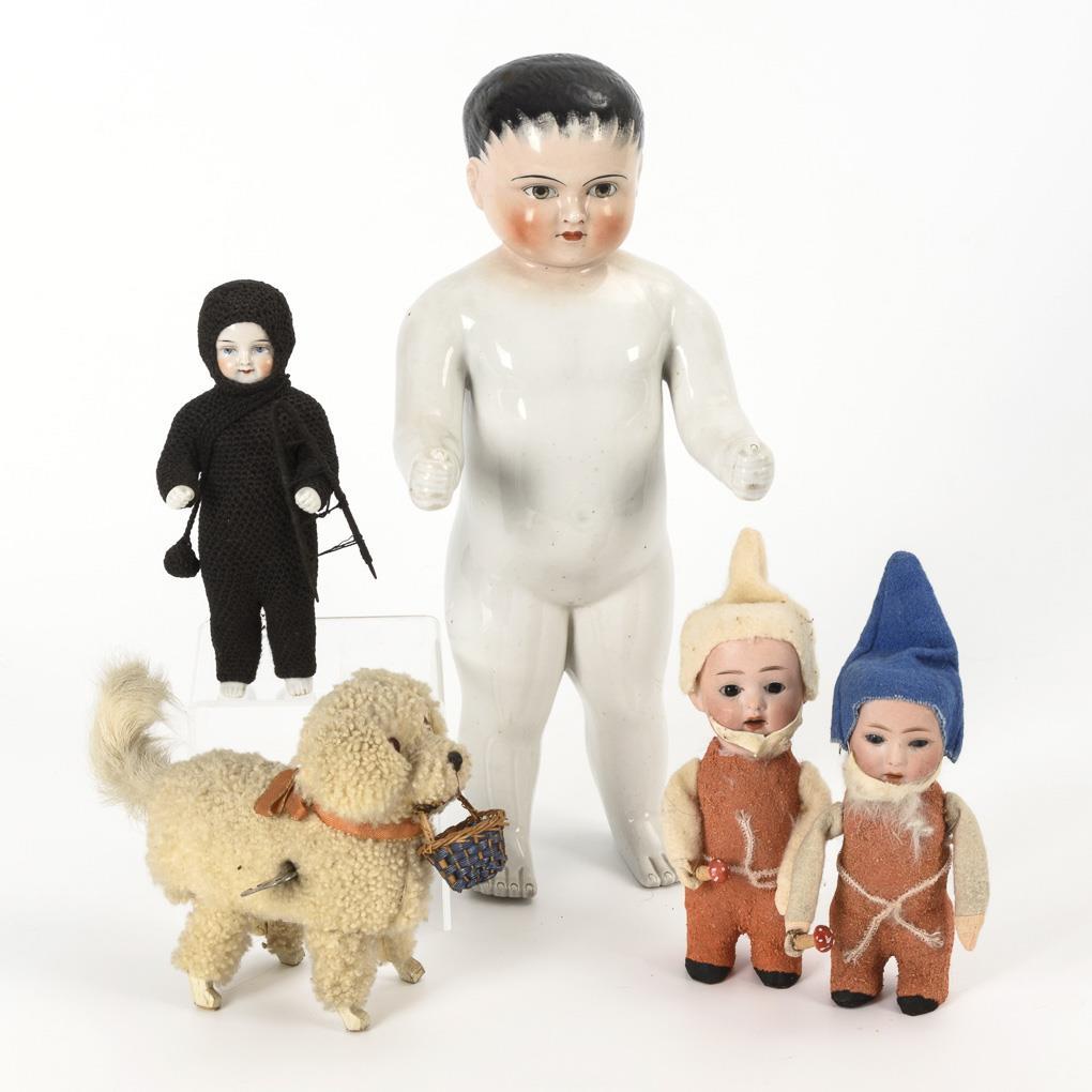 Bathing doll, crocheted bathing doll as a chimney sweep, 2 Sonneberg dwarfs with porcelain heads and mechanical dog with white fur (intact movement with key). Traces of age, porcelain without visible defects.