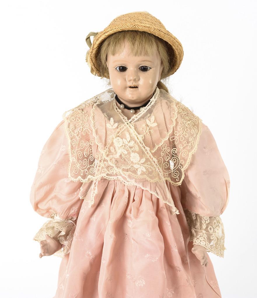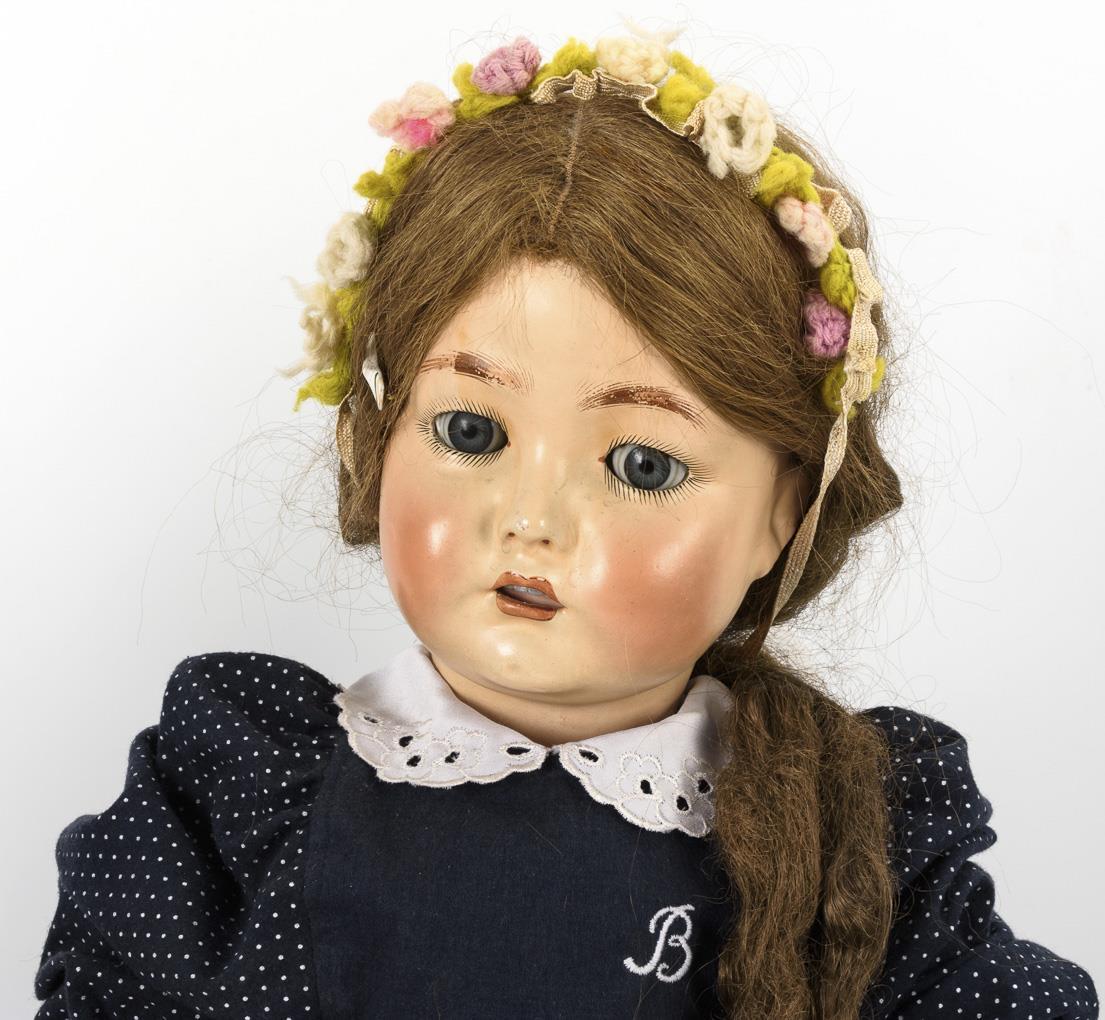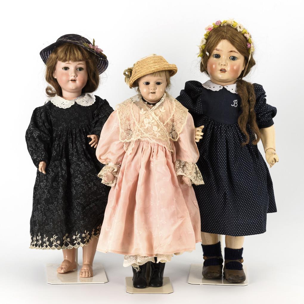 Crank head, blue sleep eyes, light brown synthetic hair wig, 15-piece limb body, dark blue dress with white dots. / Defective crank head, blue sleeping eyes, eyelashes, medium blond synthetic hair wig, 17-piece limb body, black dress with white collar. / chest head, solid brown eyes, blond wig with braids, leather body with celluloid forearms, pink dress. Signs of age, repairs and defects.