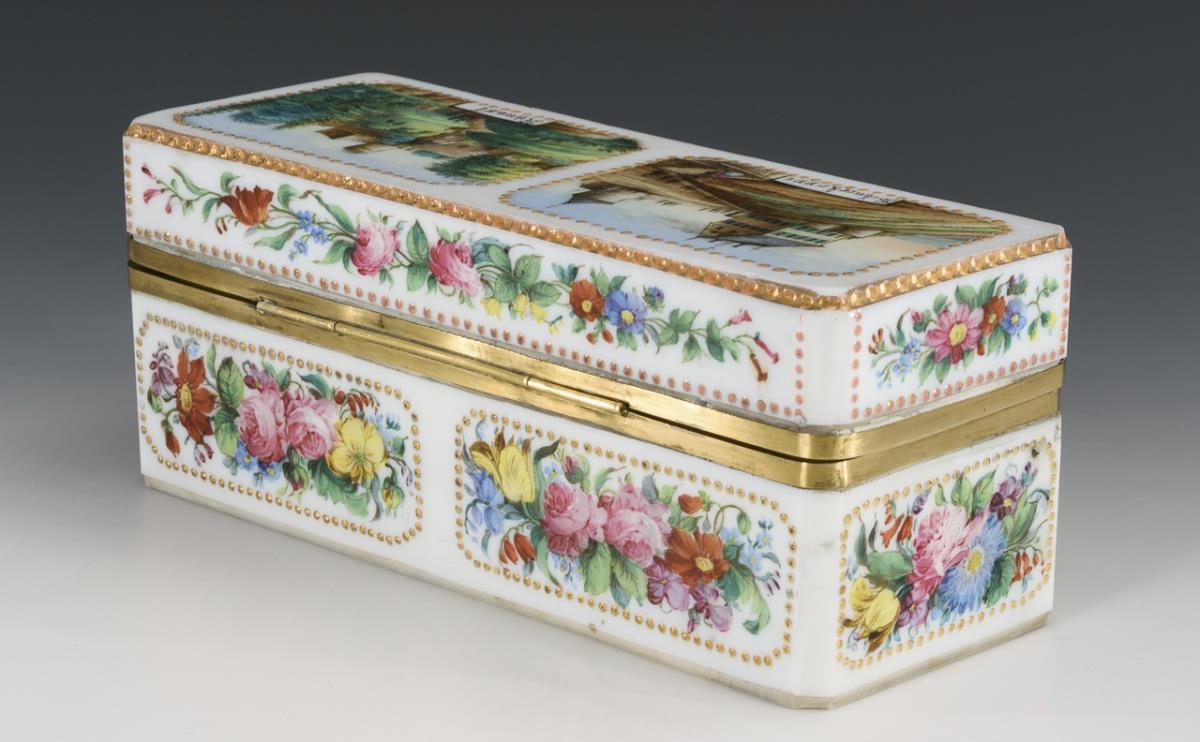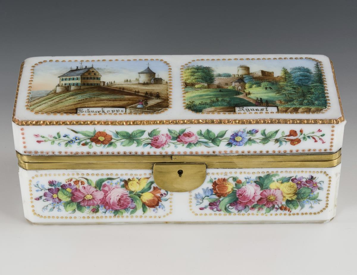 White (body) and opalescent (lid) milk glass, polychrome enamel painting, gold staffage. 9,5 x 24 x 9 cm.