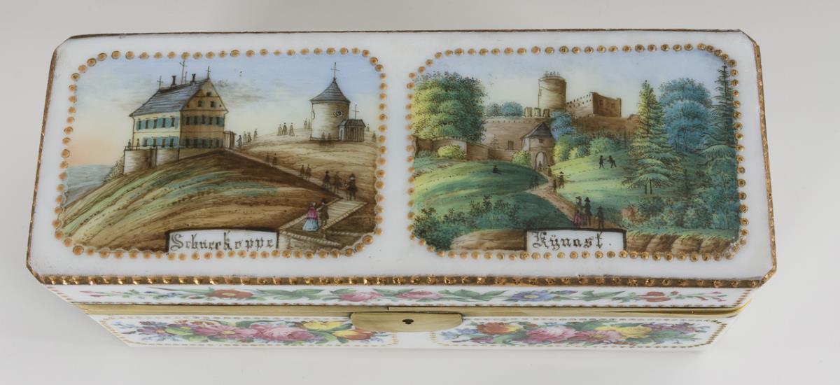 Rectangular box with metal mounted hinged lid and lock. On the lid two inscribed views of the Krkonoše Mountains (Schneekoppe, Kynast), rich floral painting on all sides. 1 corner bumped, enamel dots missing sporadically.