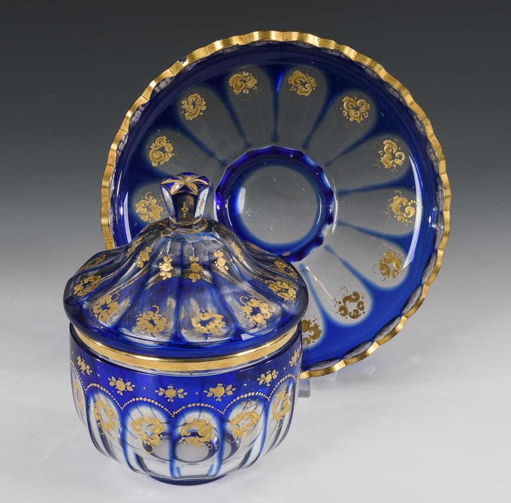Colorless glass with cobalt blue overlay, relief gold painting and gold rim. H box 16 cm, Ø presentoir 20 cm.