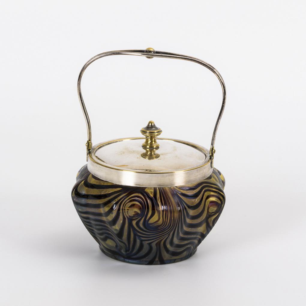 Pressed baluster form with eightfold vertically bossed wall, metal mounted rim with bow handle and knob lid.