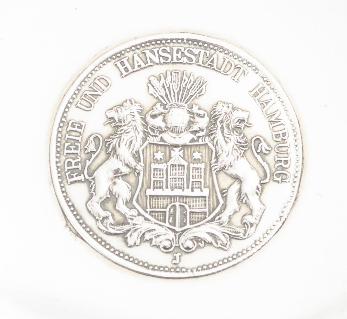 Round silver bowl with coin inlay Hamburg coat of arms, underneath "Fünf Mark Deutsches Reich 1906". Slight signs of wear.