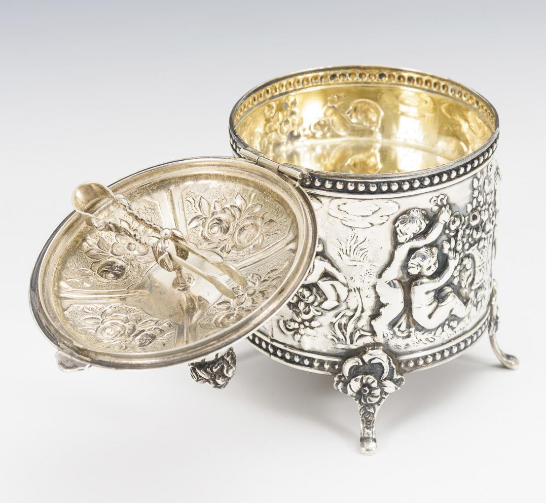 Round relief box with putti and roses, hinged lid with vase knob, on 4 feet. Inside very high set box bottom, in the lid a tongs holder.