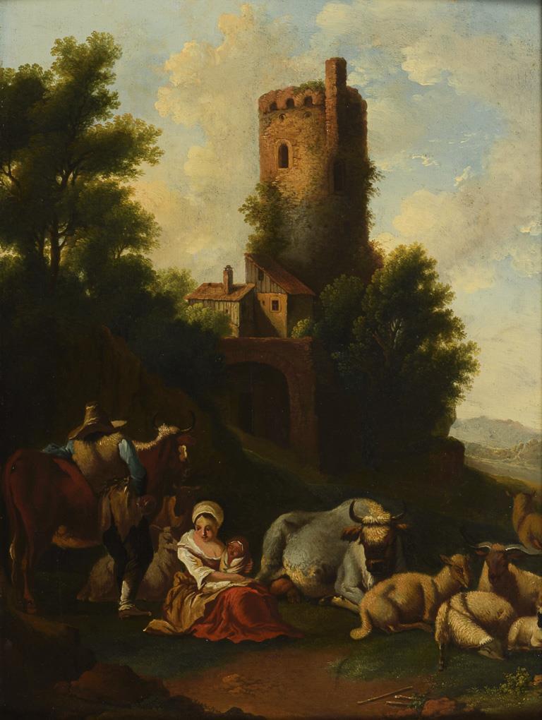 The couple with the child and the resting animals in the sunshine near a tower. Traces of age.