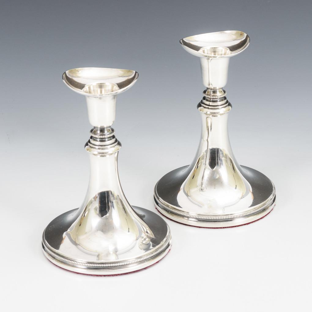 1-flame candlesticks with oval grommets and round base with beaded edge. At the stem each dented.