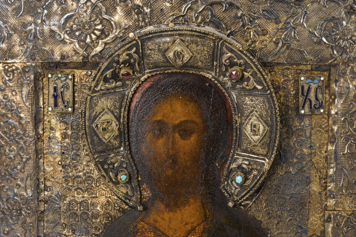 Eitempera/wood, brass oklad with garnets and turquoises. Russia. Late 19th c.