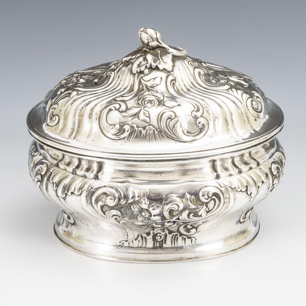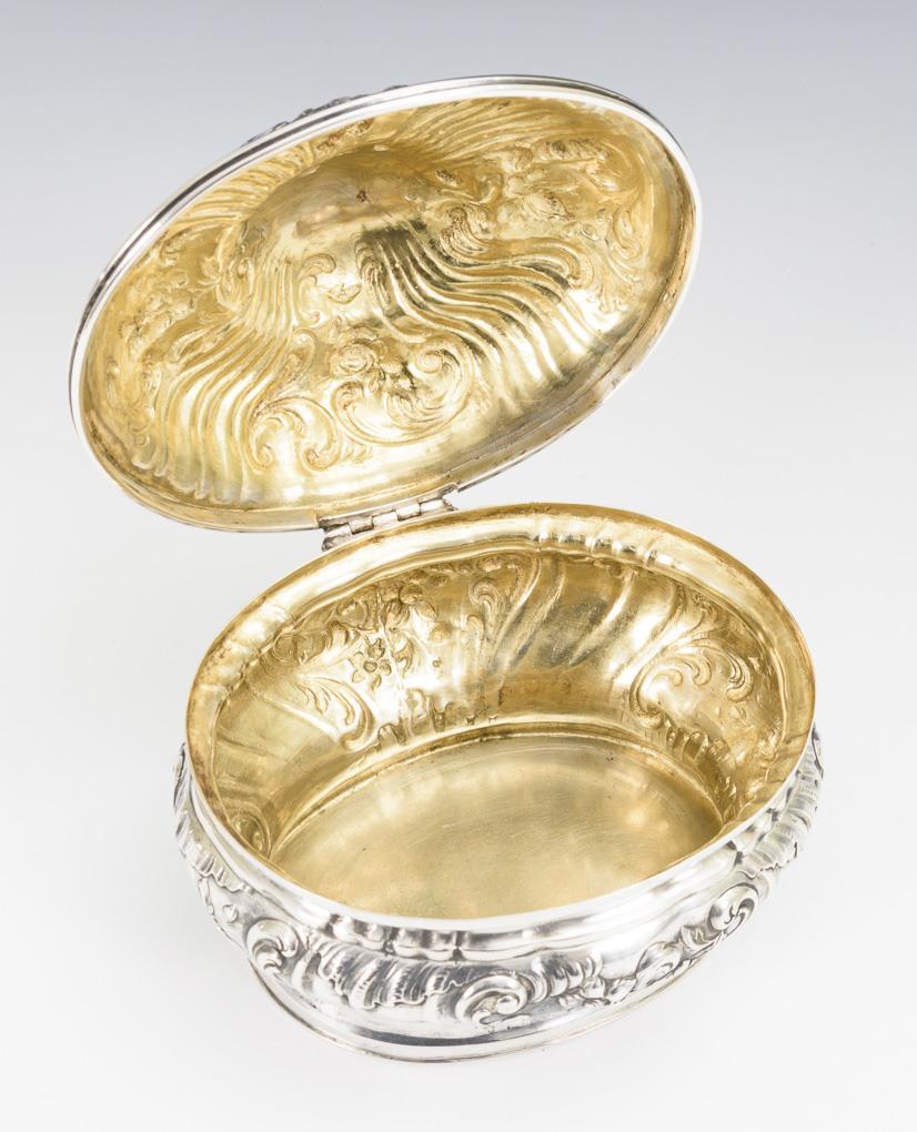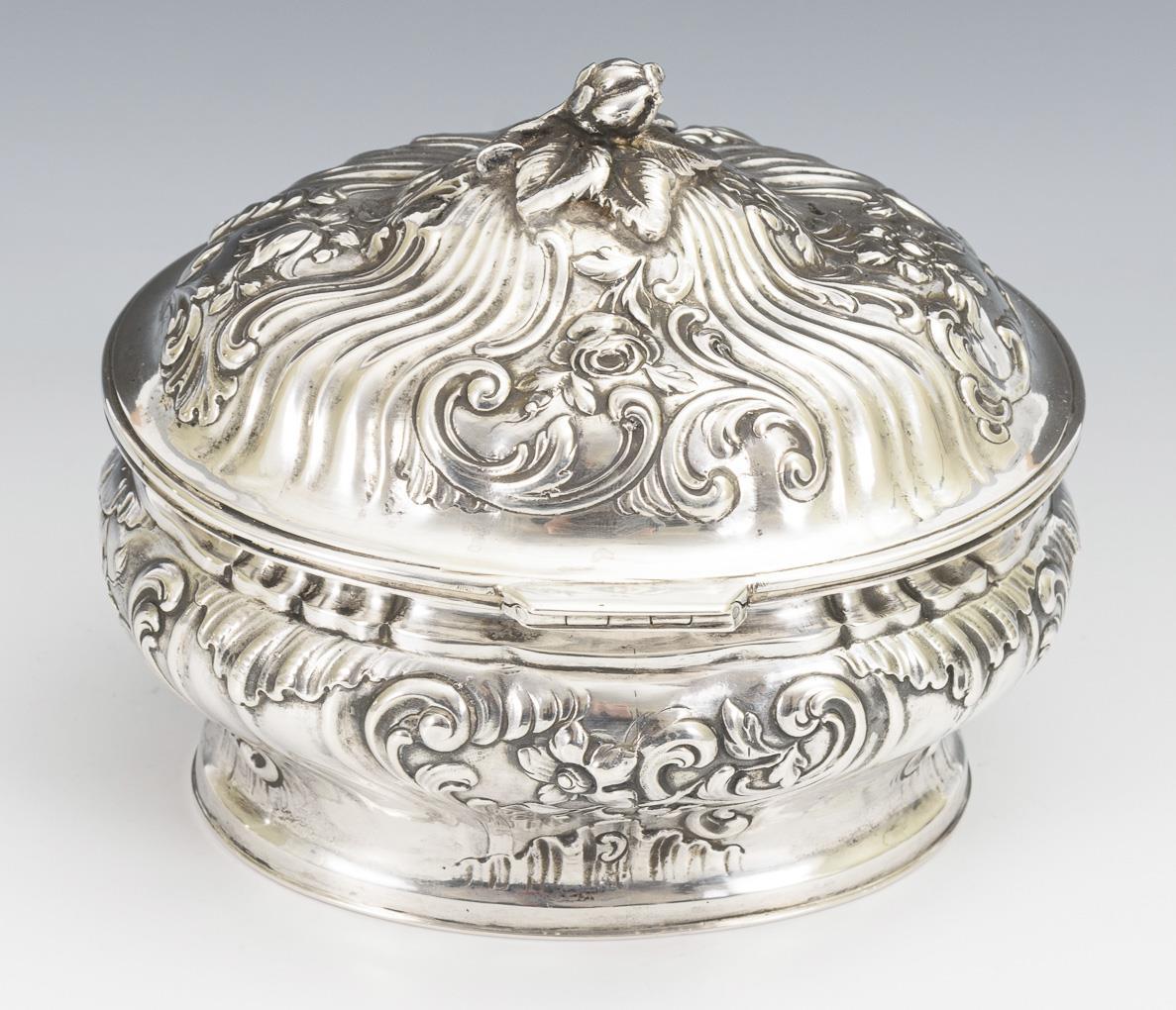 Oval relief box with hinged lid and fruit knob. Historicist rocaille and floral decoration.
