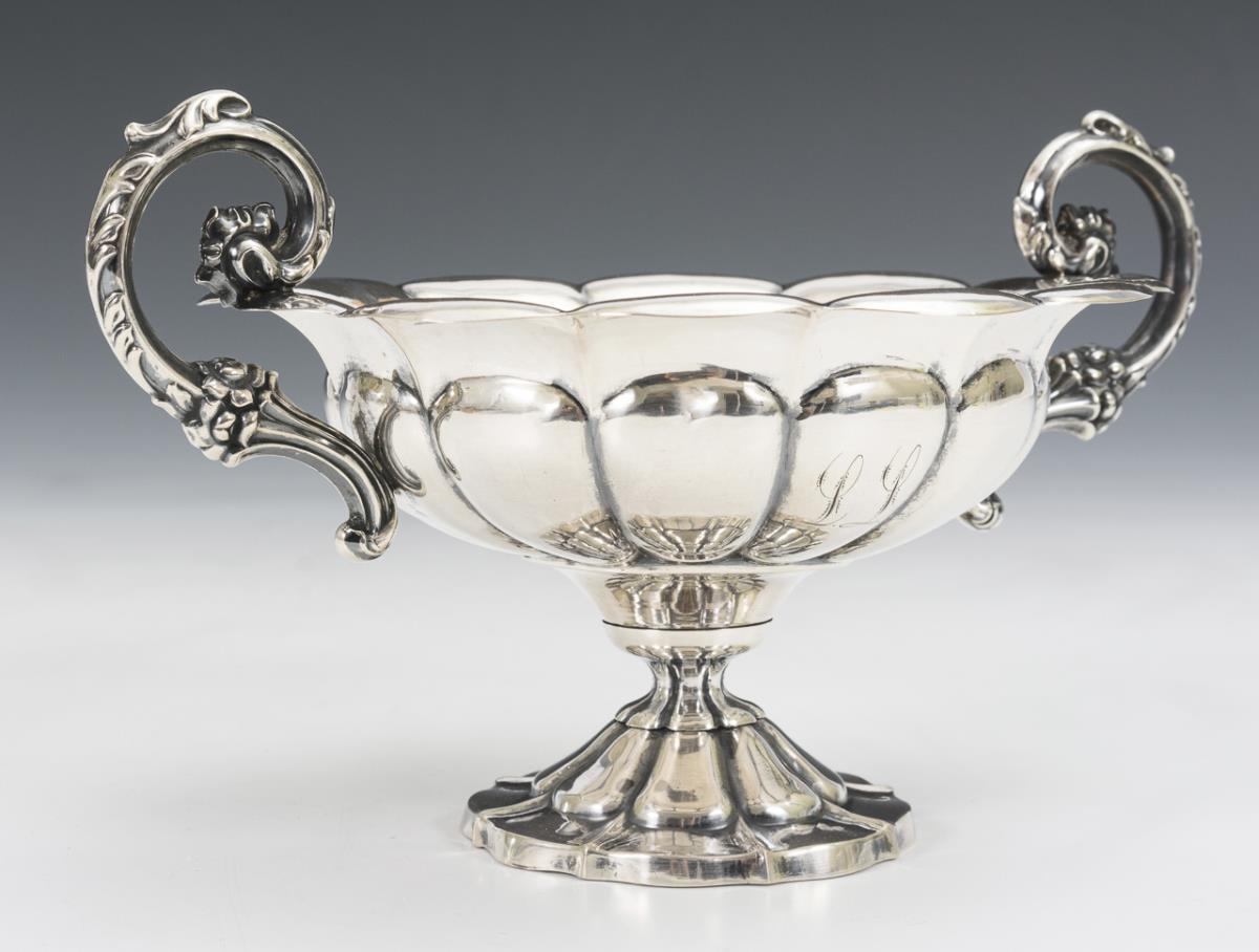 Round humped bowl with 2 rocaille handles and floral round base, wall with engraved initials "LL".