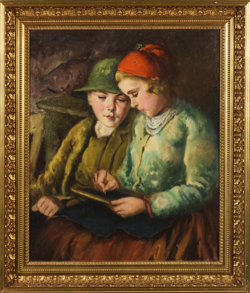 The children with concentrated look at a writing tablet.