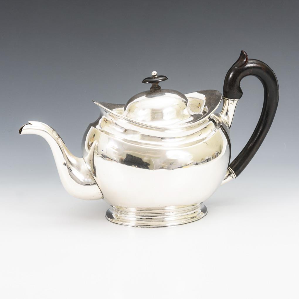 Elegant jug with ebonized wooden handle. Small dents and soldered joints.