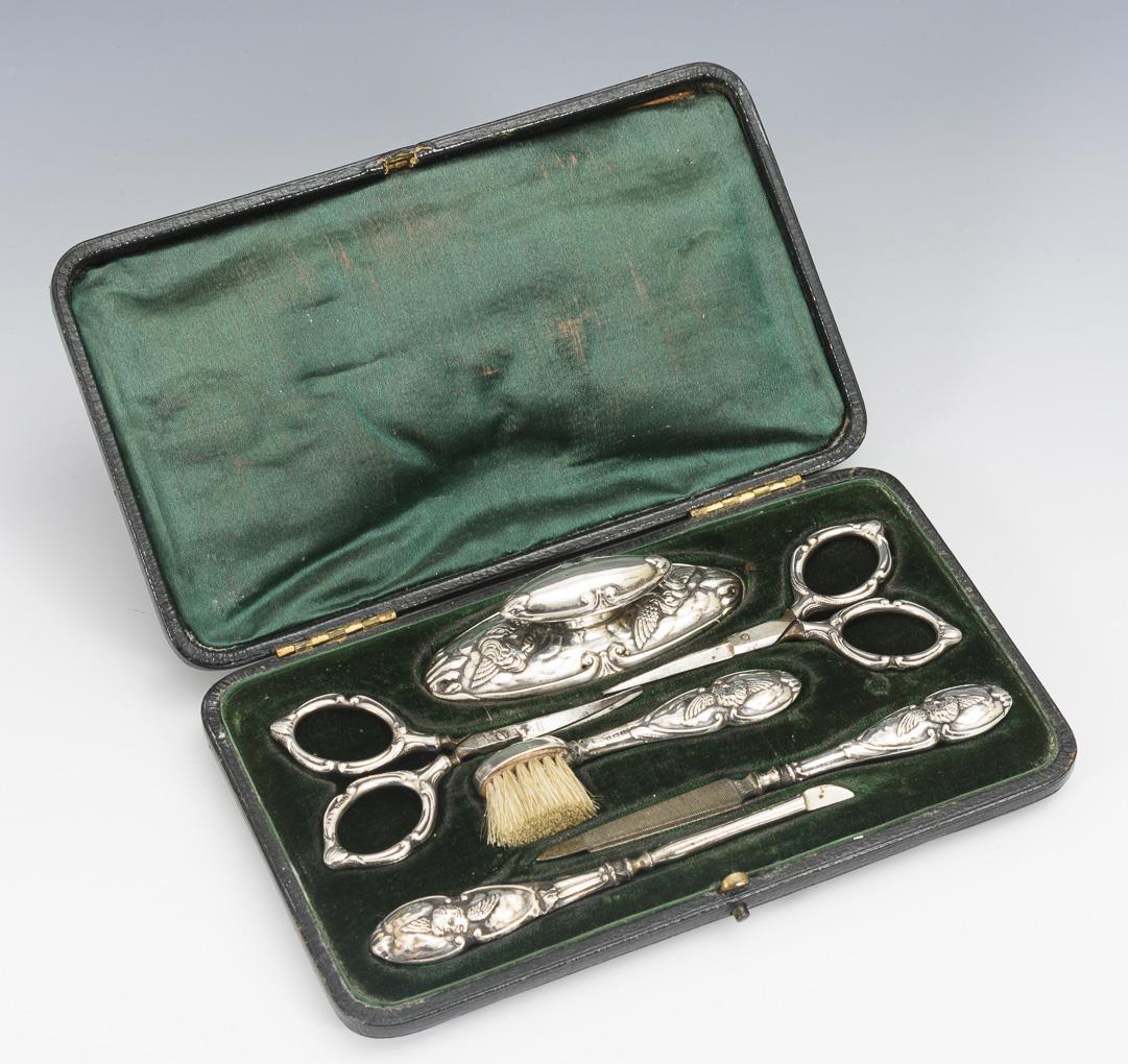 6-piece nail set with relief handles. In black case with green lining. Signs of age and use, small defects.