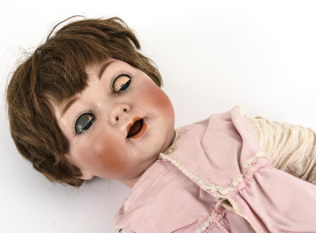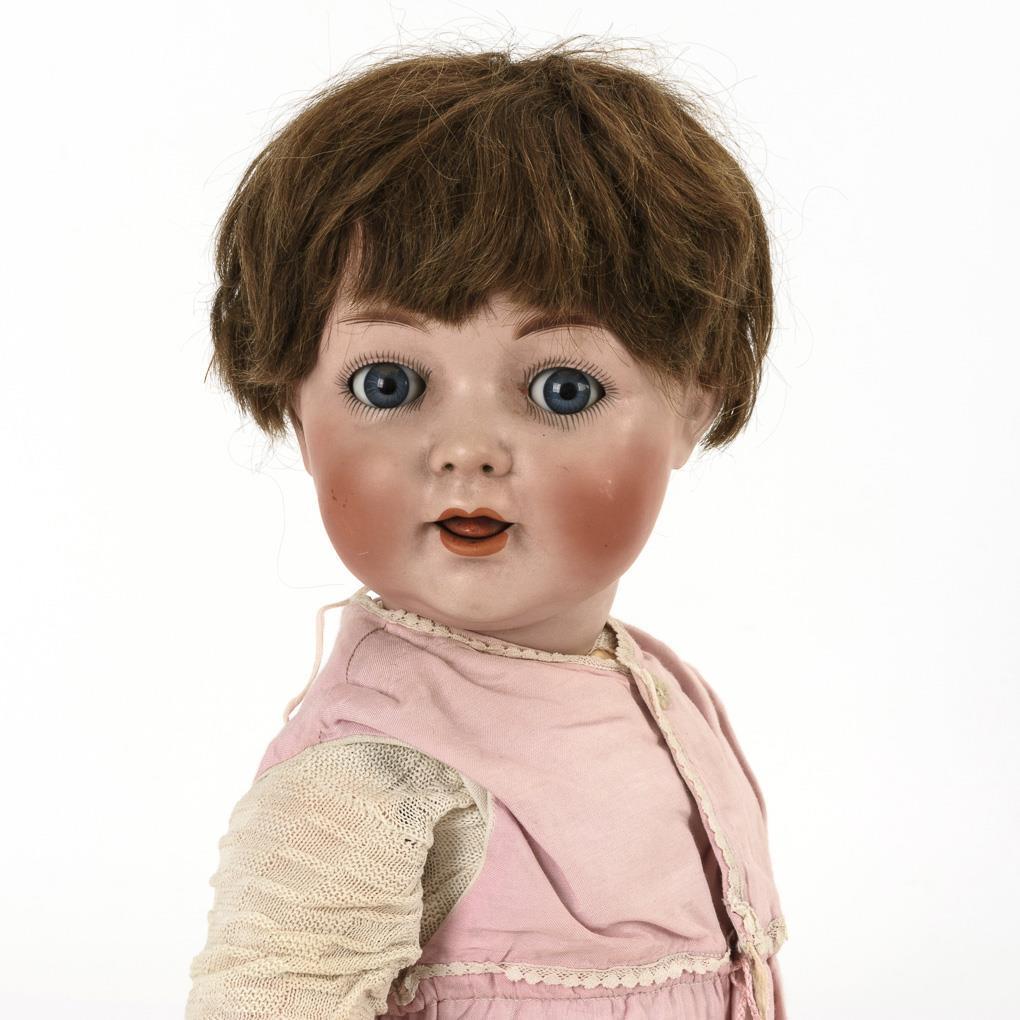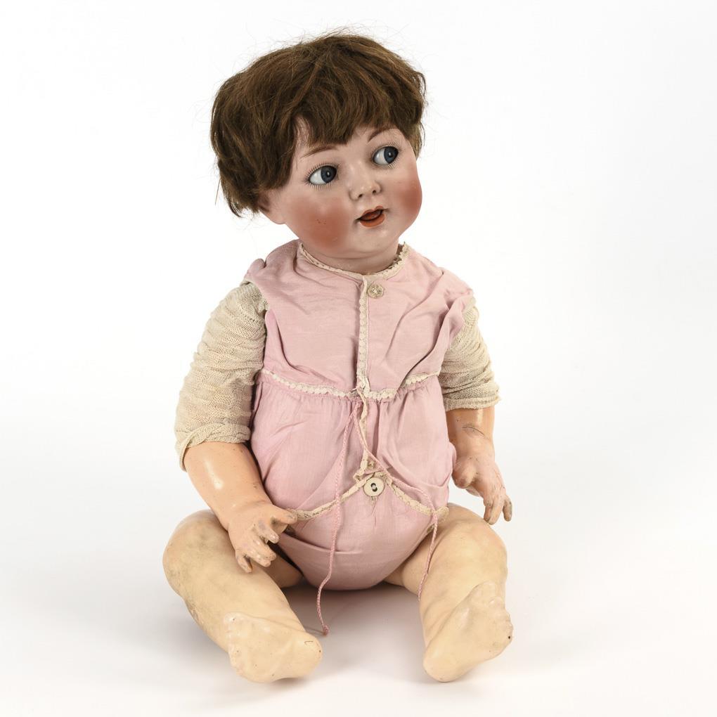 Crank head, blue sleeping/shelmet eyes, open nostrils, flutter tongue, brown human hair wig. 5-piece sitting baby body with intact voice. Pink shirt panties. Head x-rayed: without defects, eyelids rubbed. Loose tension, left hand with fixed color defects.