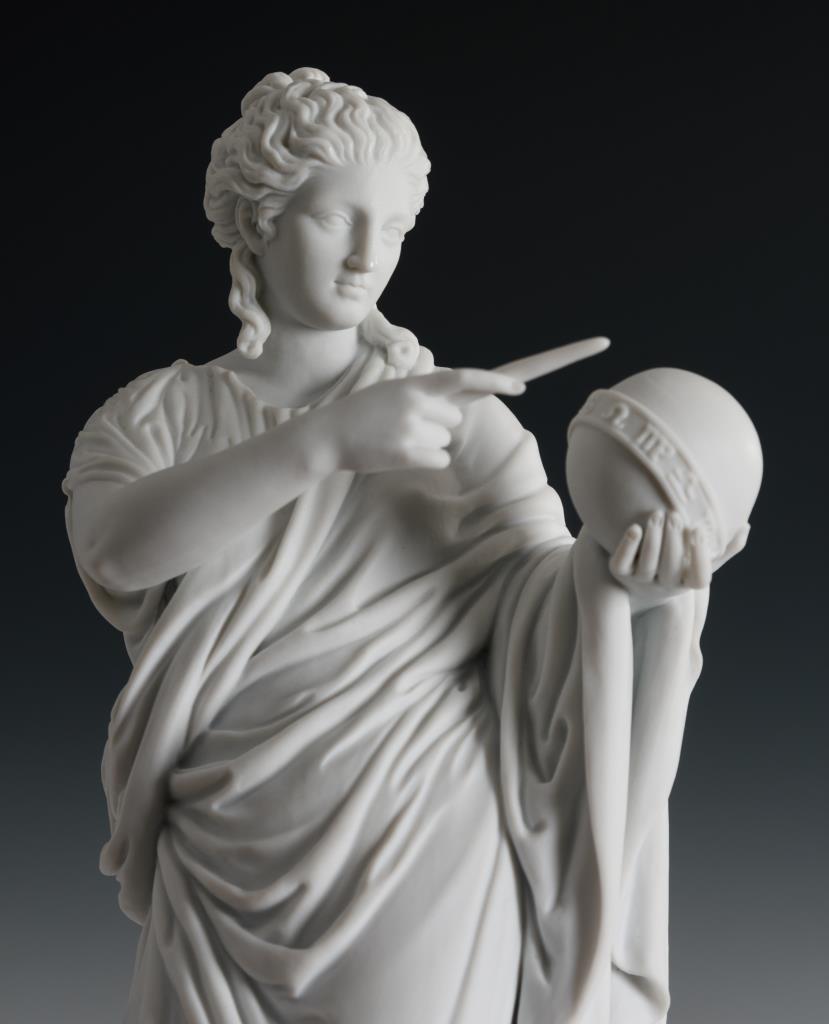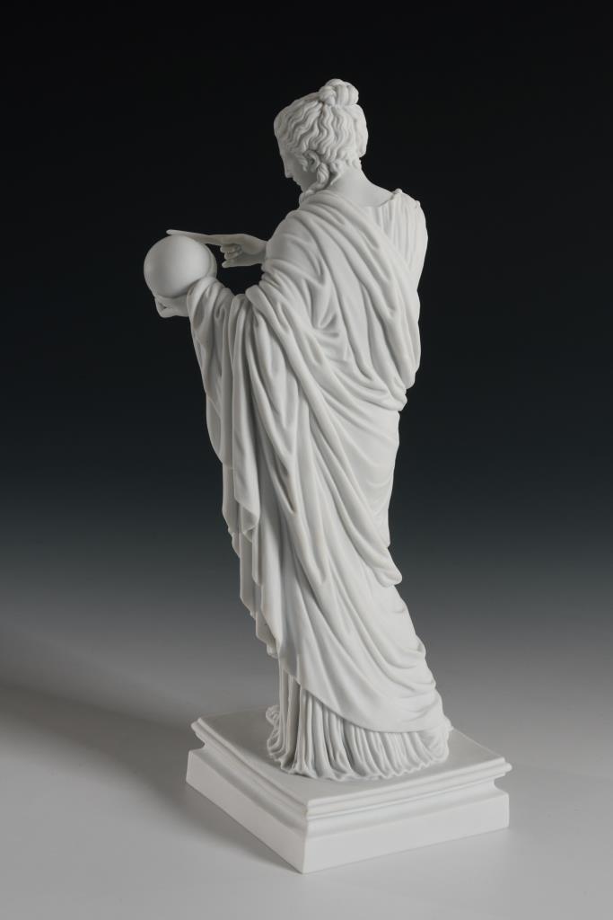 Auf einem Quadratsockel stehende, antik gekleidete Muse der Astronomie mit Weltkugel .