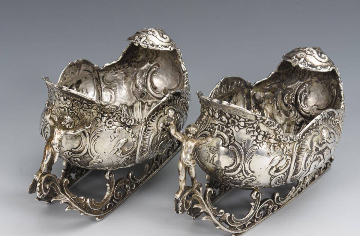 Richly relieved, small table vessels with putti decoration. In the Hanau style.