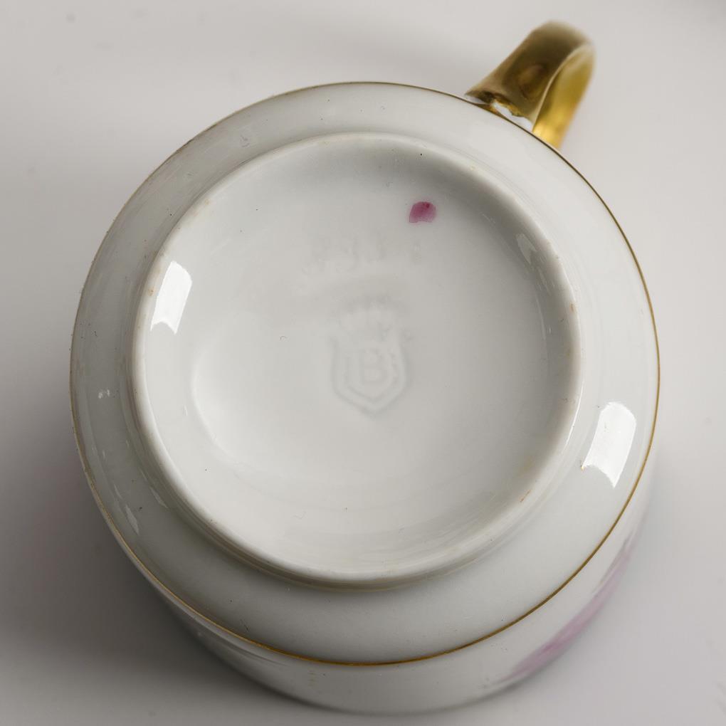 37 pieces. Coffee pot (h 23,5 cm), creamer, sugar bowl, 10 cups, 11 saucers, 11 cake plates, 1 credenza plate and 1 centerpiece. 1 cake plate with hairline crack, hairline crack on the edge of the credenza plate and 1 cup wall, partial minimal gold wear.
