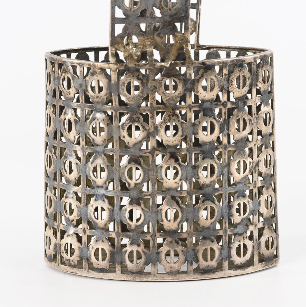 Basket with stamped, bossed floral design and wide ribbon handle. Several variants of this type by Josef Hoffmann. Soldered spots on the handle attachments. Glass insert is missing.