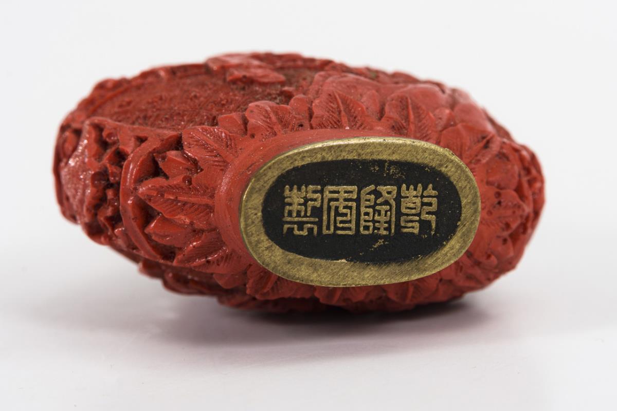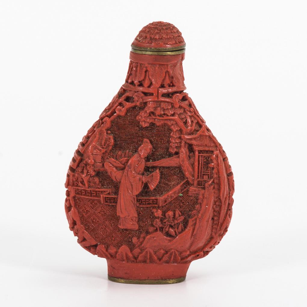 Drop-shaped bottle with two depictions of women in landscape. Stopper with lancet.