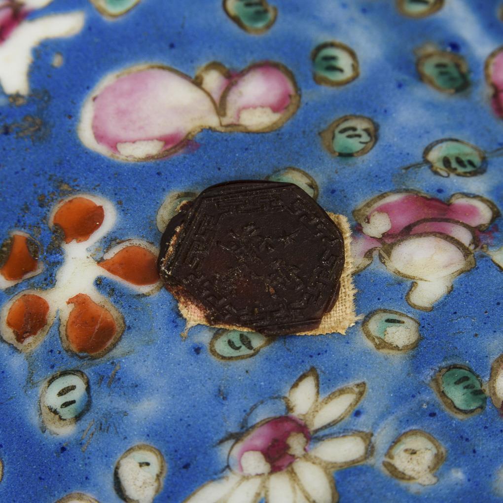 Old, bearded man with cane, blue topknot at the back. Polychrome painted kimono with floral pattern. Small opening in the ears. On the back export seal.