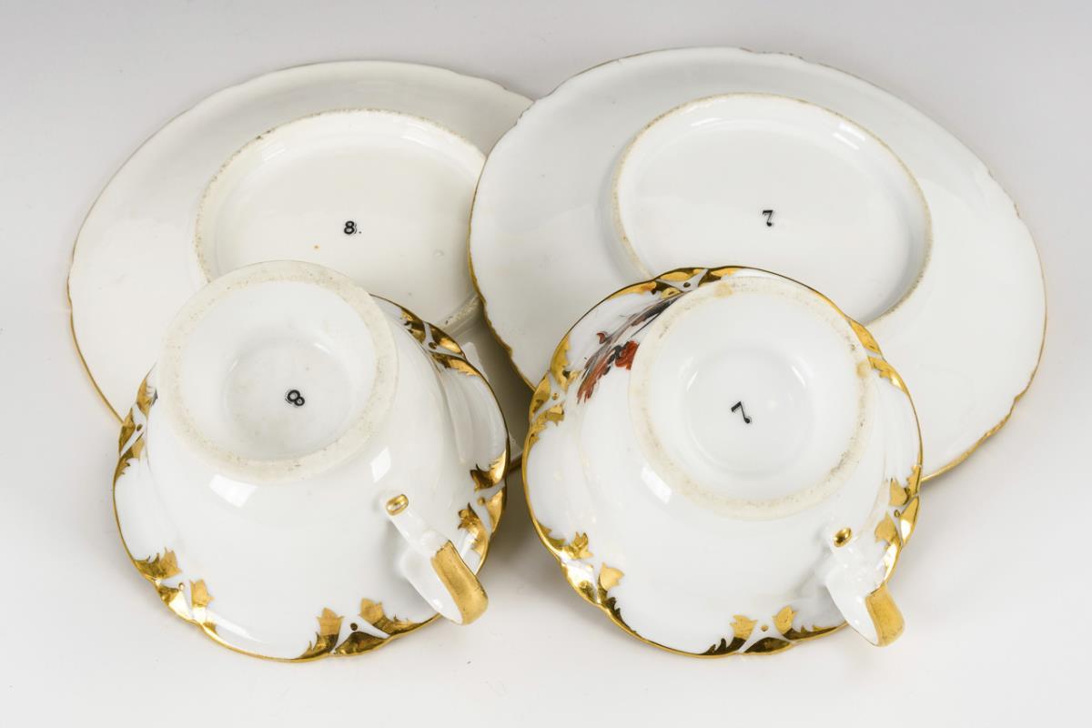 Polychrome painted, gold and silver decorated. H cups 6,5 cm, Ø original saucers 15,5 cm.