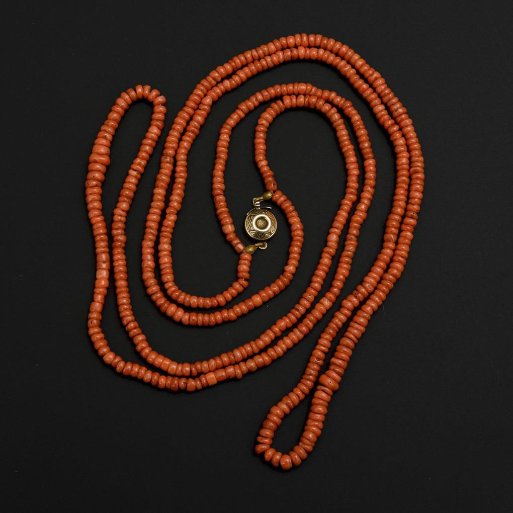 Lacing chains with coral discs on decorative lock. Lock coral missing.