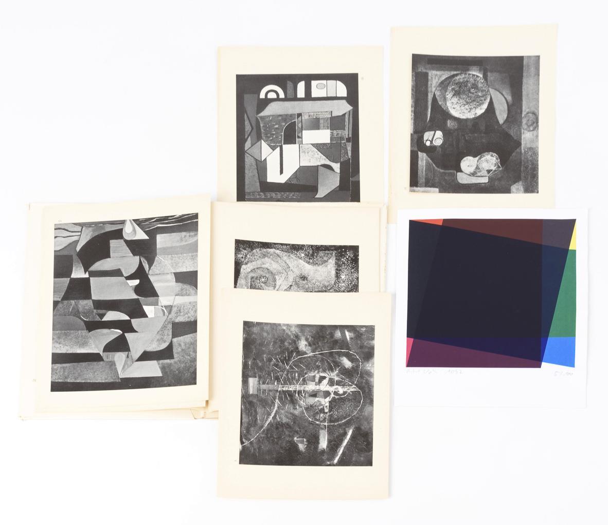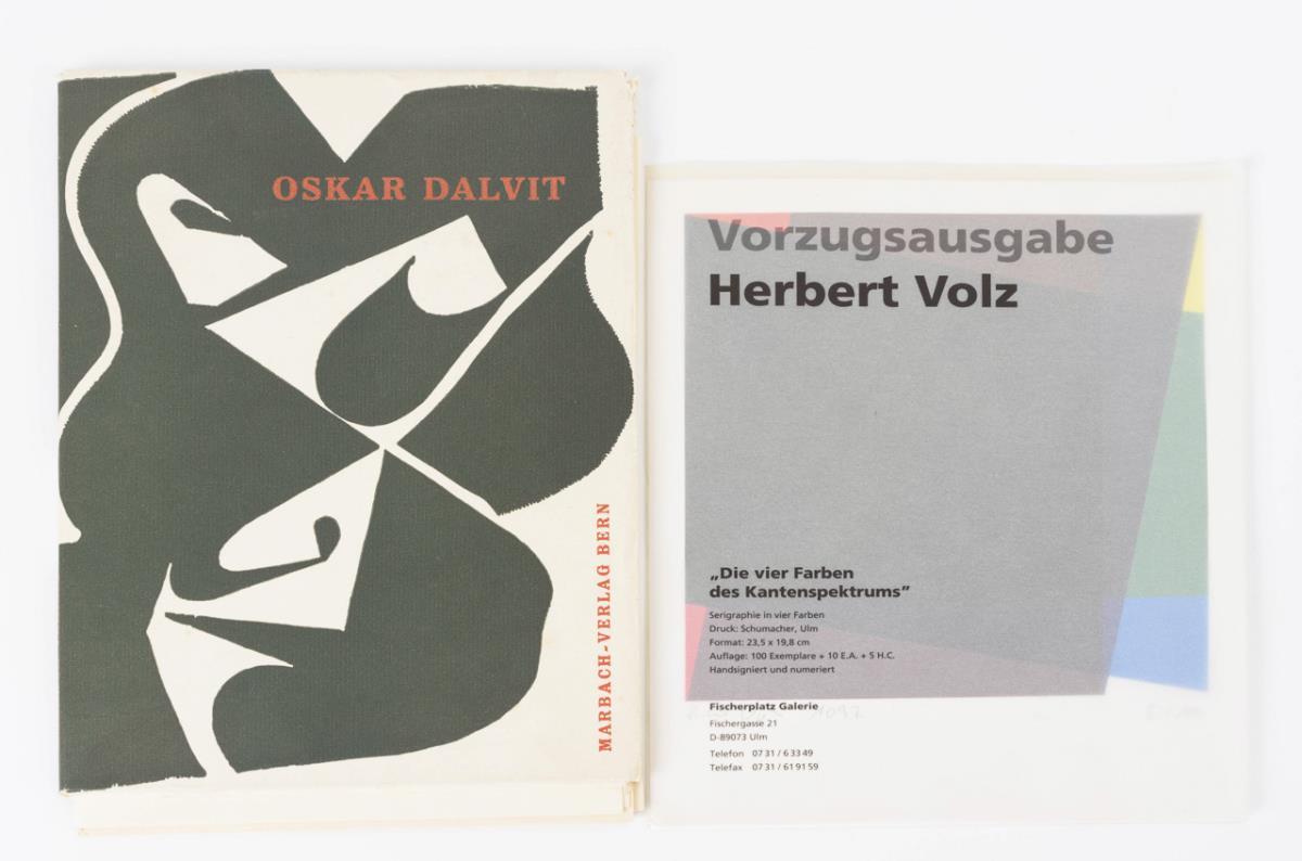 2x Eugenio Carmi: Composition with red circle, sheet each: 42 x 42 cm, each color silkscreen | Herbert Volz: "Die vier Farben des Kantenspektrums", sheet: 23,5 x 19,8 cm, copy: 5/100, pencil signature, in original protective sheet | Oskar Dalvit: Complete portfolio with 10 plates after originals by the artist and accompanying text, portfolio: 25.5 x 18.5 cm, in original cardboard dust jacket, Marbach-Verlag Bern, plate 1: original color woodcut with pencil signature, copy: 928/1000, dated 1949; jacket with traces of use.