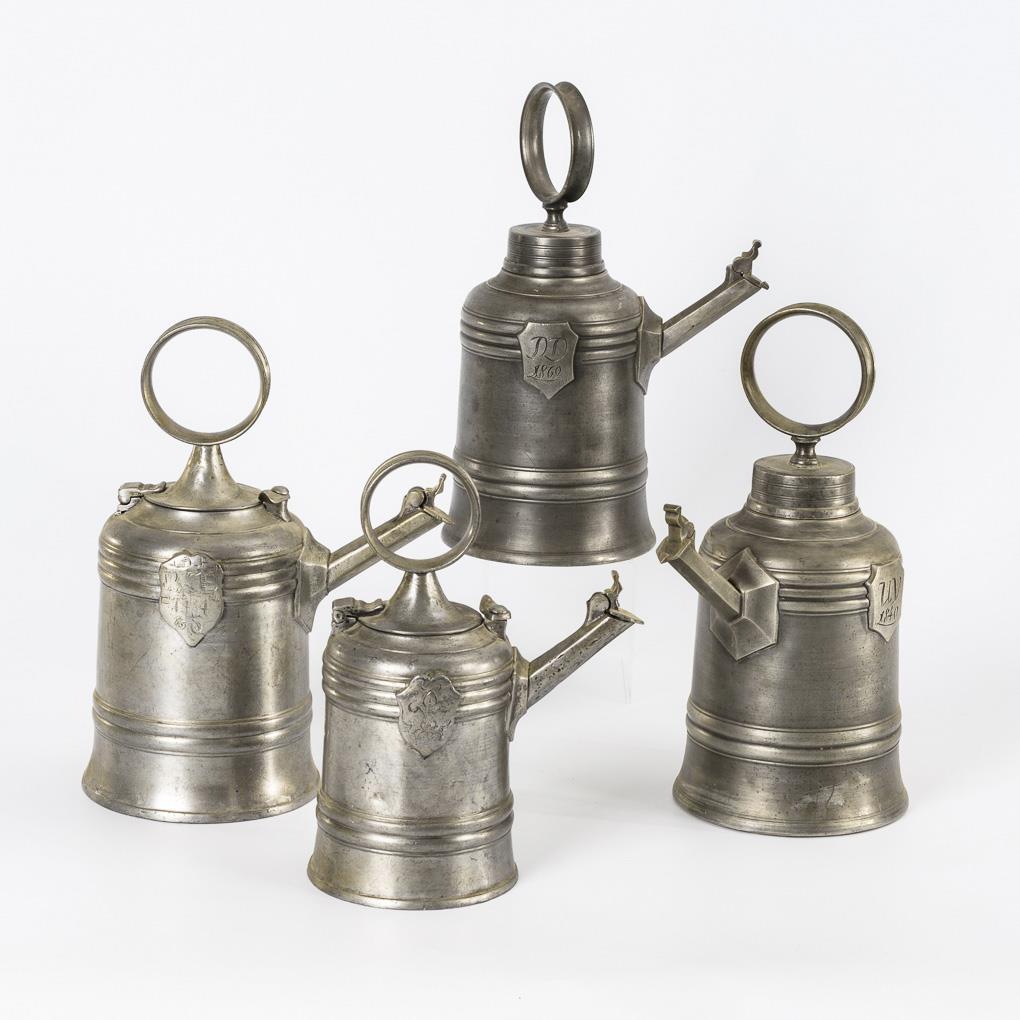 Similar jugs with applied escutcheons on the shoulders. 2 probably baroque tankards with hinged lids as well as coat of arms engraving "BSE 1734" and with fleur-de-lis respectively. 2 identical tankards on the crest each "1840" with monograms "DD" and "UV". 1 solder repair to the hinged lid, each with some signs of age/use.