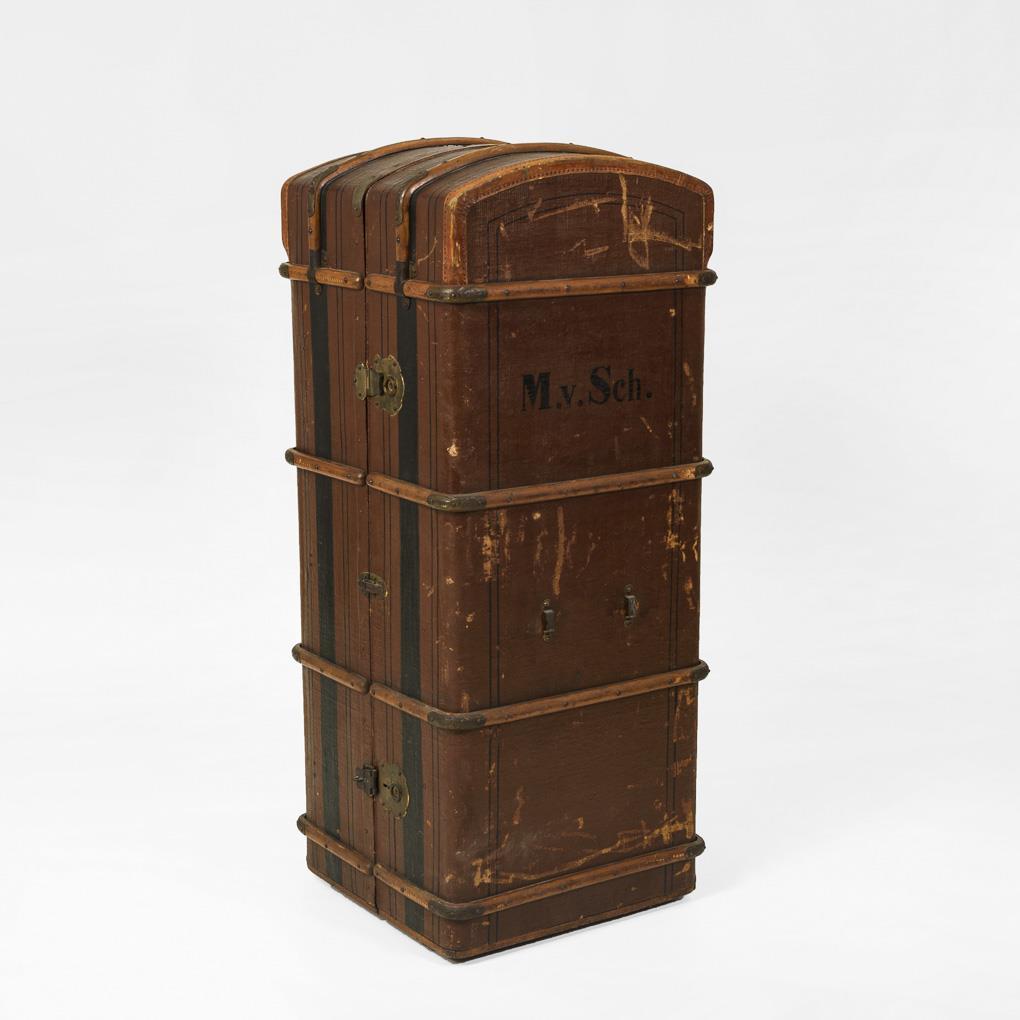 Cabinet trunk/travel case standing on ball casters with 2 locks, leather carrying handle tabs and wooden reinforcing braces. Inscribed on the door "M.v.Sch.", inside "Familie Max von Scheidl, Freiburg Breisgau". Inside cloth straps and pull-out bail bar and 6 wooden drawers with leather handles in the door. 1 handle flap missing, 3 leather handles torn, signs of age/use.