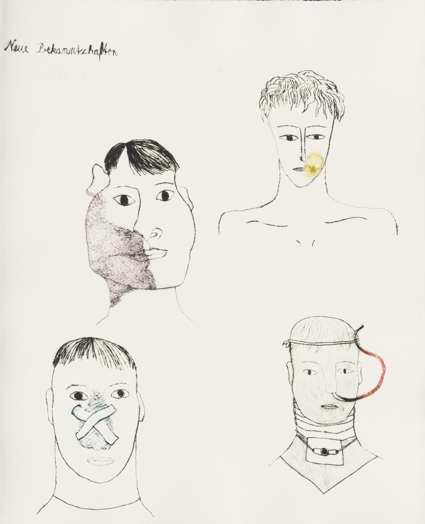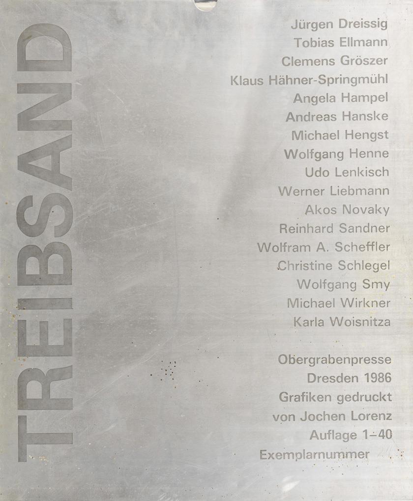 Original metal slipcase with 17 works by Jürgen Dreissig, Tobias Ellmann, Clemens Gröszer Angela Hampel, Klaus Hähner-Springmühl, Andreas Hanske, Michael Hengst, Wolfgang Henne, Udo Lenkisch, Werner Liebmann, Akos Novaky, Reinhard Sandner, Wolfram Adalbert Scheffler, Christine Schlegel, Wolfgang Smy, Michael Wirkner and Karla Woisnitza, plus supplement recto with an introductory text by Christoph Tannert and verso details of the artists. Aluminium slipcase with loosened glue, stains and scratches.